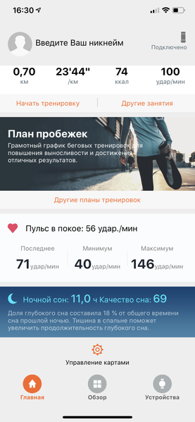Любую тренировку надо вручную запустить и вручную же остановить. То есть даже если вы, например, выберете ходьбу и в какой-то момент прекратите идти, но забудете остановить тренировку, автоматически она не остановится. Информация о тренировках и общих результатах активности оказывается в смартфонном приложении. Там же можно увидеть данные по пульсу, пройденному расстоянию, подъемам и сну.