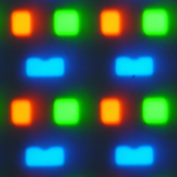 В этом экране используется OLED-матрица — активная матрица на органических светодиодах. Полноцветное изображение создается с помощью субпикселей трех цветов — красного (R), зеленого (G) и синего (B) в равном количестве, что подтверждается фрагментом микрофотографии: