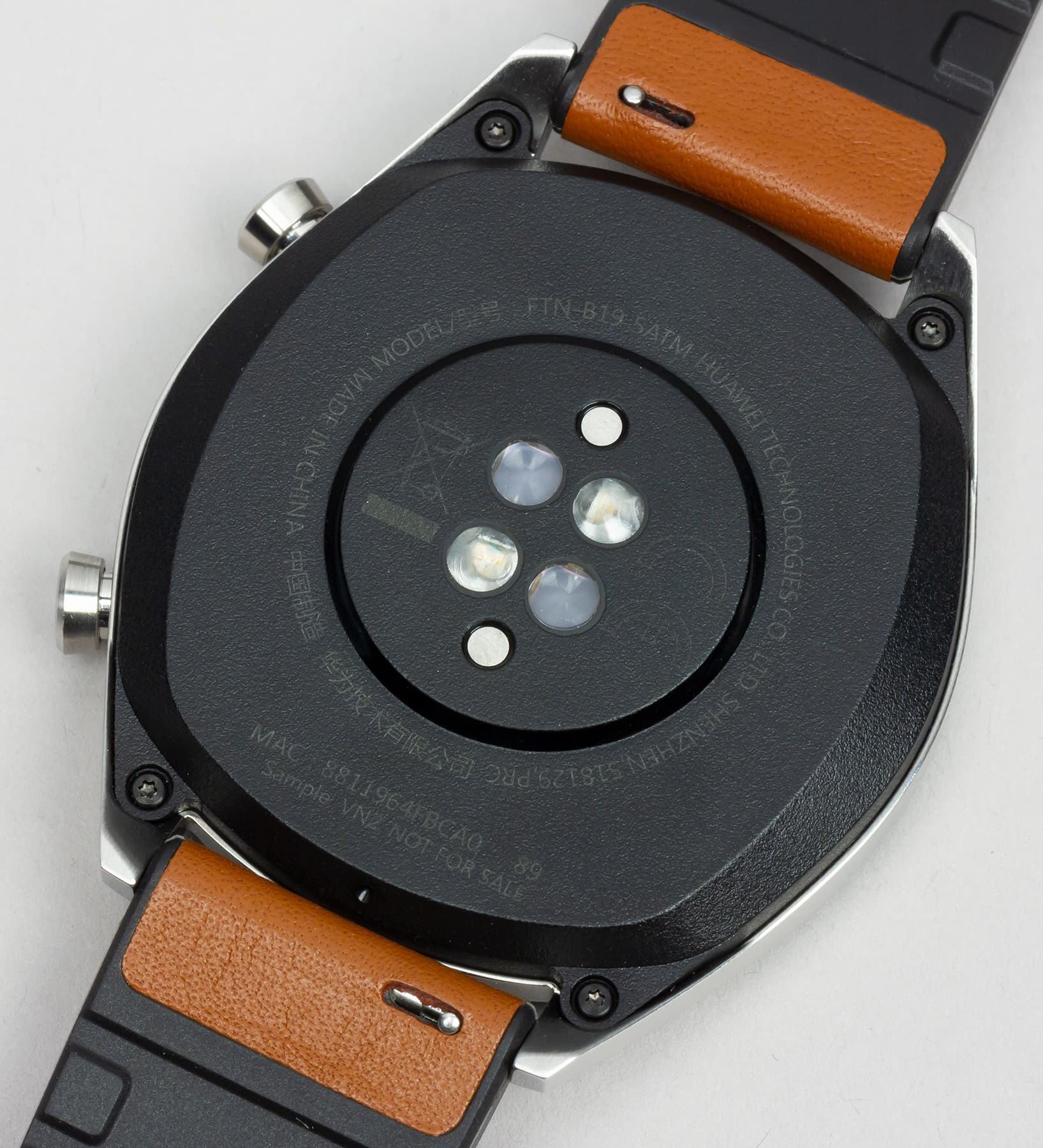 Тыльная поверхность корпуса часов выполнена из черного матового пластика, по центру расположен модуль с датчиком сердечного ритма.