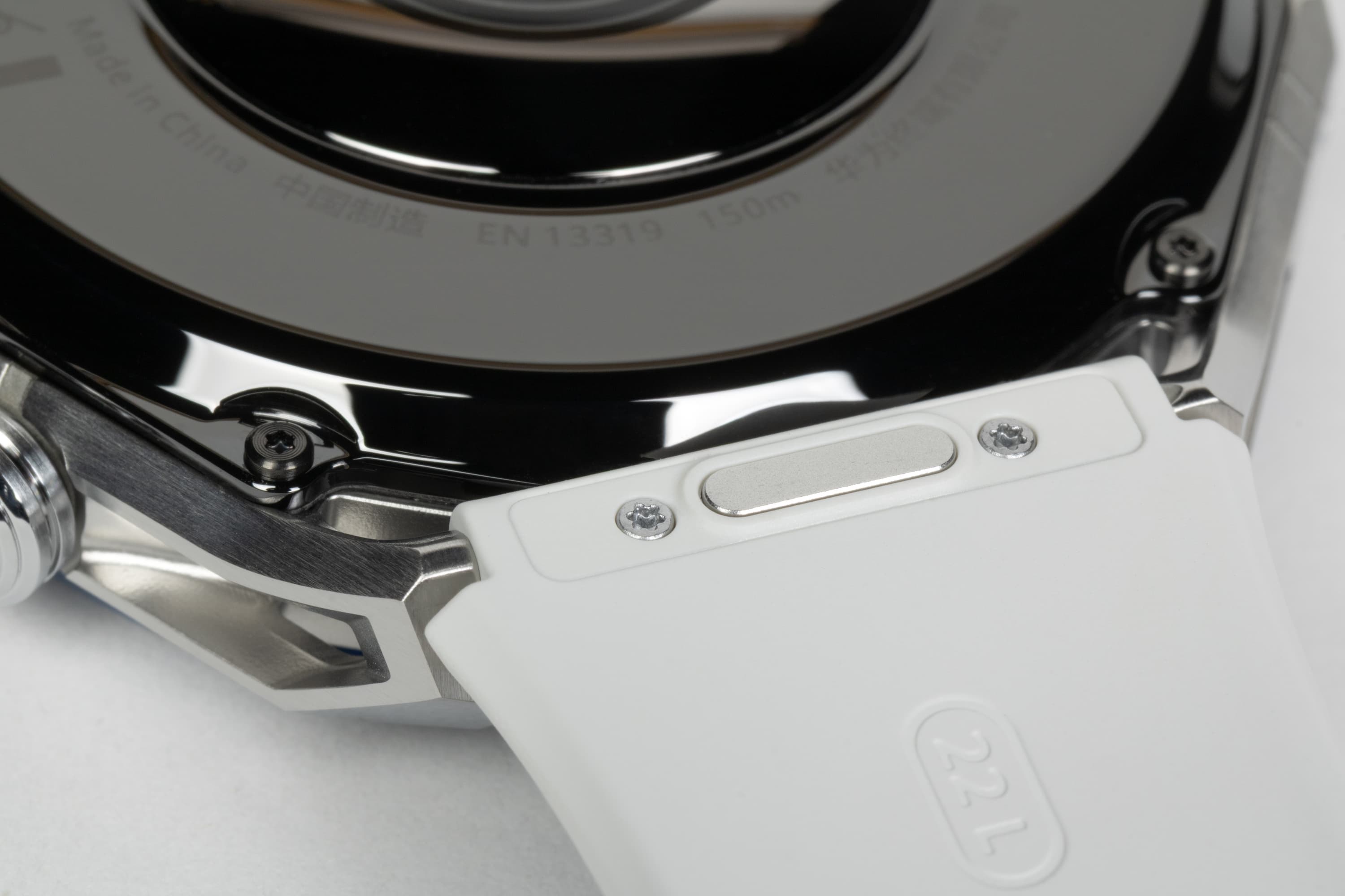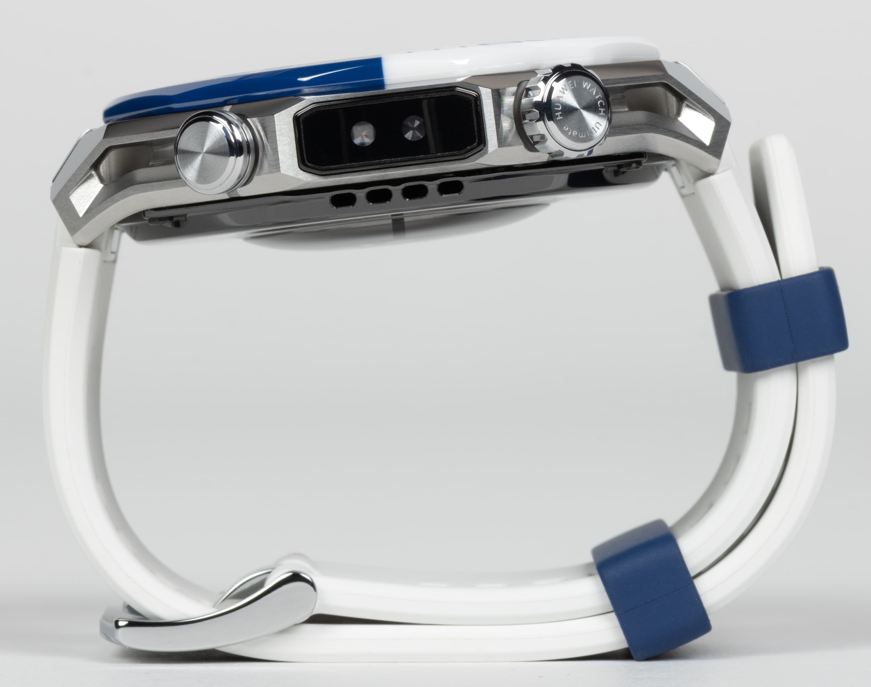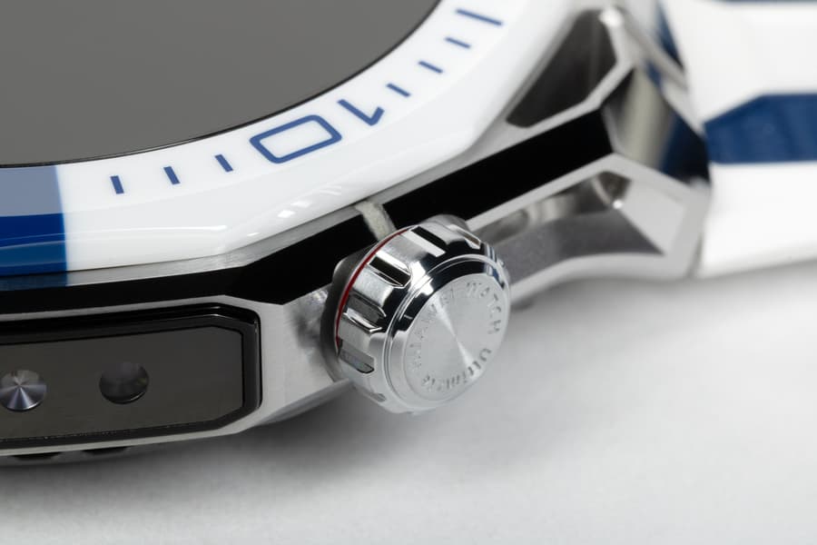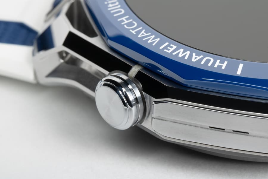 И если на синей части безеля гравировка белая, то на белой — синяя. Это, прежде всего, цифры и насечки, но также надпись «Huawei Watch Ultimate» — раньше она была вынесена на грань безеля, теперь же идет прямо по нему.