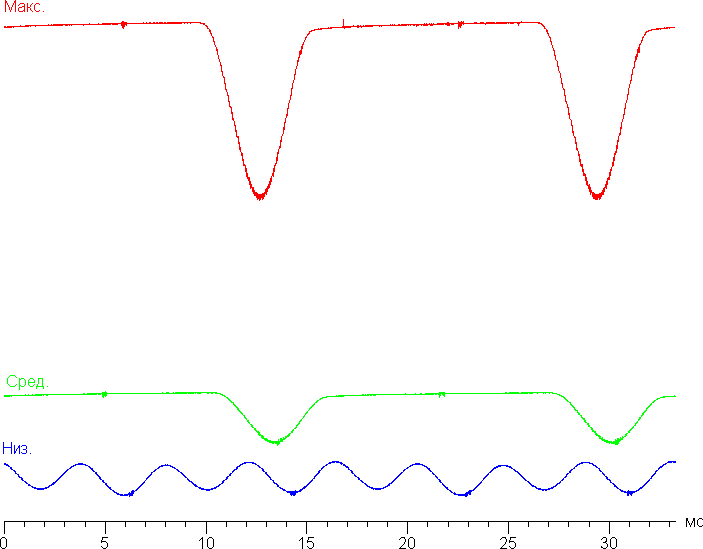 На графике зависимости яркости от времени определяется значимая модуляция с частотой 60 Гц (высокая и средняя яркость) или 240 Гц (низкая яркость), а при желании на некоторых изображениях при быстром движении часов относительно глаз можно выявить стробоскопических эффект. Однако по факту при обычном использовании мерцание не обнаруживается, так как фаза модуляции различается по площади экрана. На рисунке ниже приведены зависимости яркости (вертикальная ось) от времени (горизонтальная ось) для нескольких (условных) значений настройки яркости.