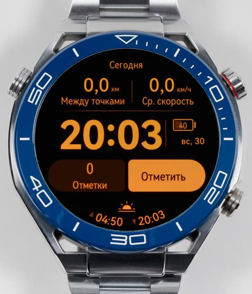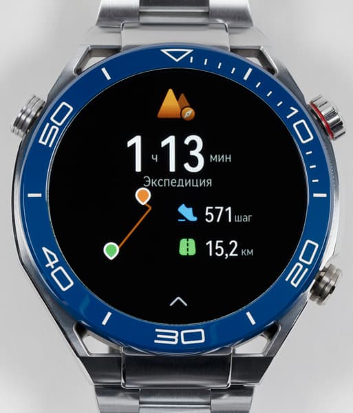 Верхняя правая (напротив значения «10» минутной стрелки) — «Домой»/«Меню». Нижняя (значение «20») по умолчанию запускает тренировки, но ее можно переназначить и на другие опции — с этим мы уже сталкивались в других моделях линейки Huawei Watch. А вот третья кнопка, на левой стороне, у значения «50», запускает режим «Экспедиция» и не предполагает перепрограммирования. Что, пожалуй, не очень хорошо, поскольку отметки маршрута — это явно не самая популярная задача. Логика выделения отдельной кнопки под нее, видимо, в том, чтобы обеспечить максимальное удобство в непростых условиях походов, восхождений на горы и т. д.