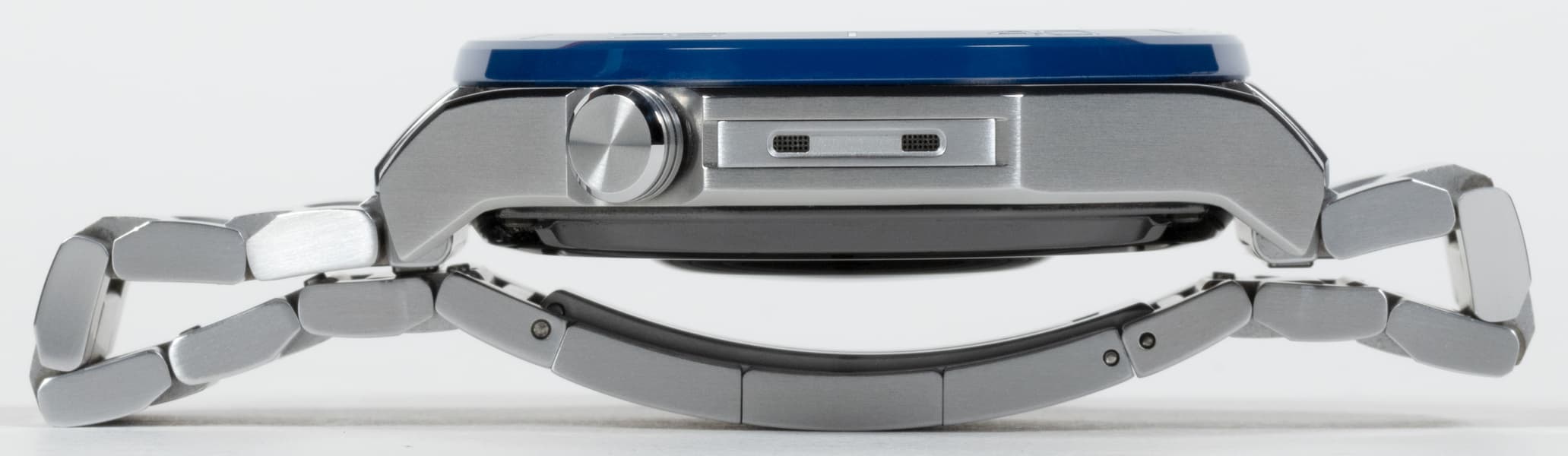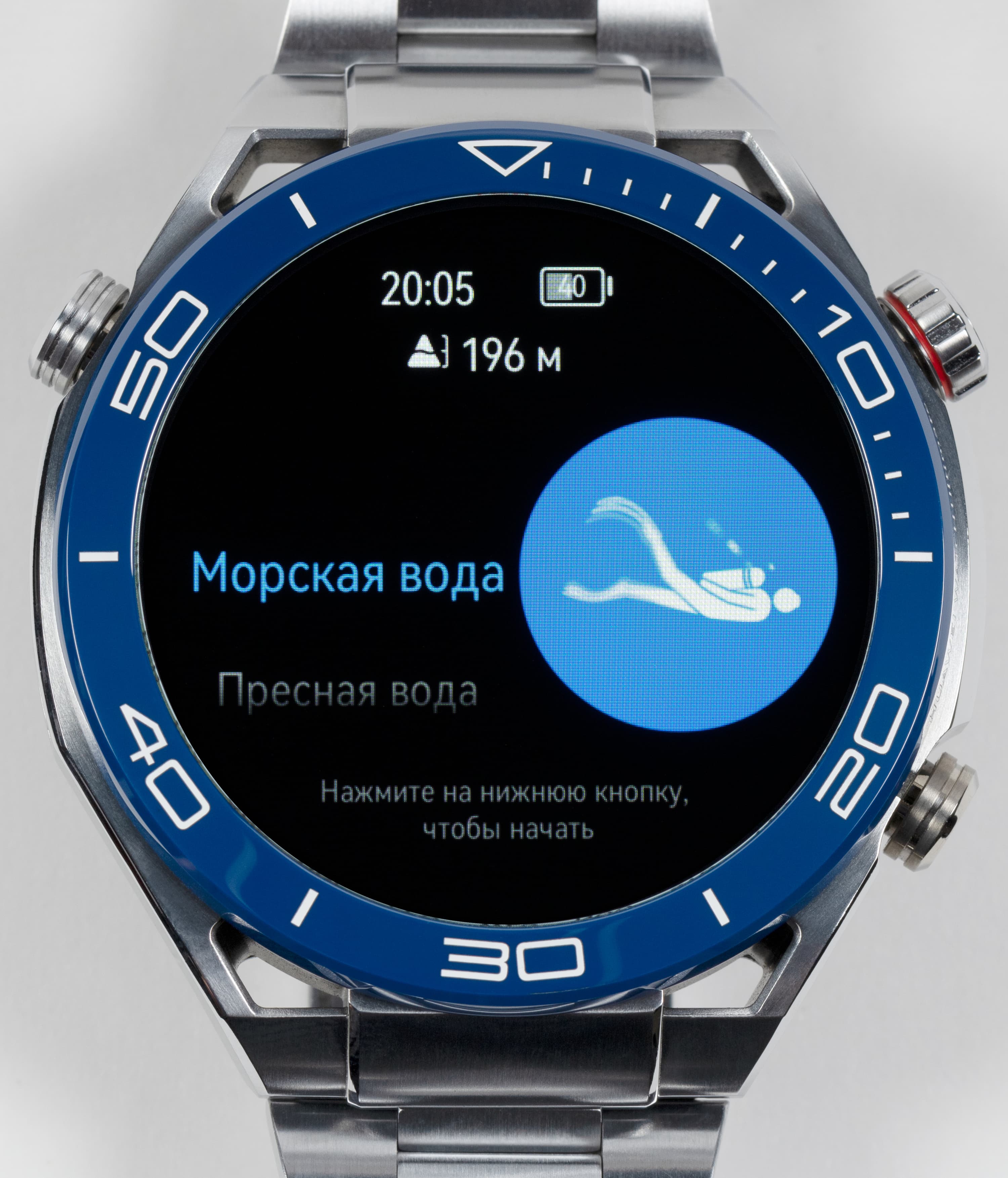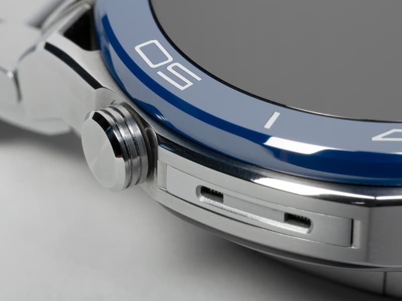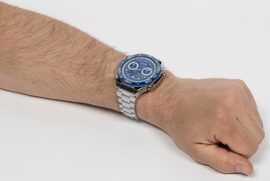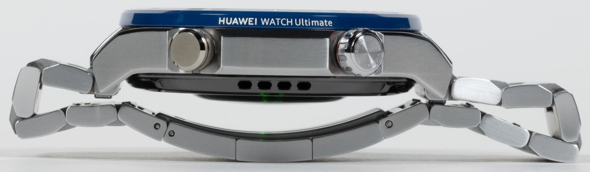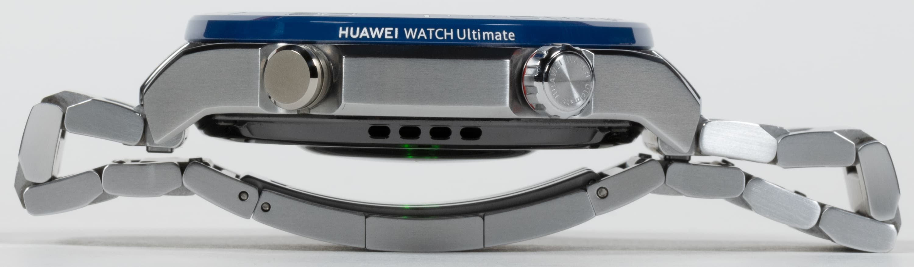 Часы Huawei Watch Ultimate выпускаются в двух цветовых вариантах — черном и сине-серебристом. У первого ремешок из каучука, у второго — из титановых звеньев. У нас на тестировании была сине-серебристая модель с титановым браслетом.