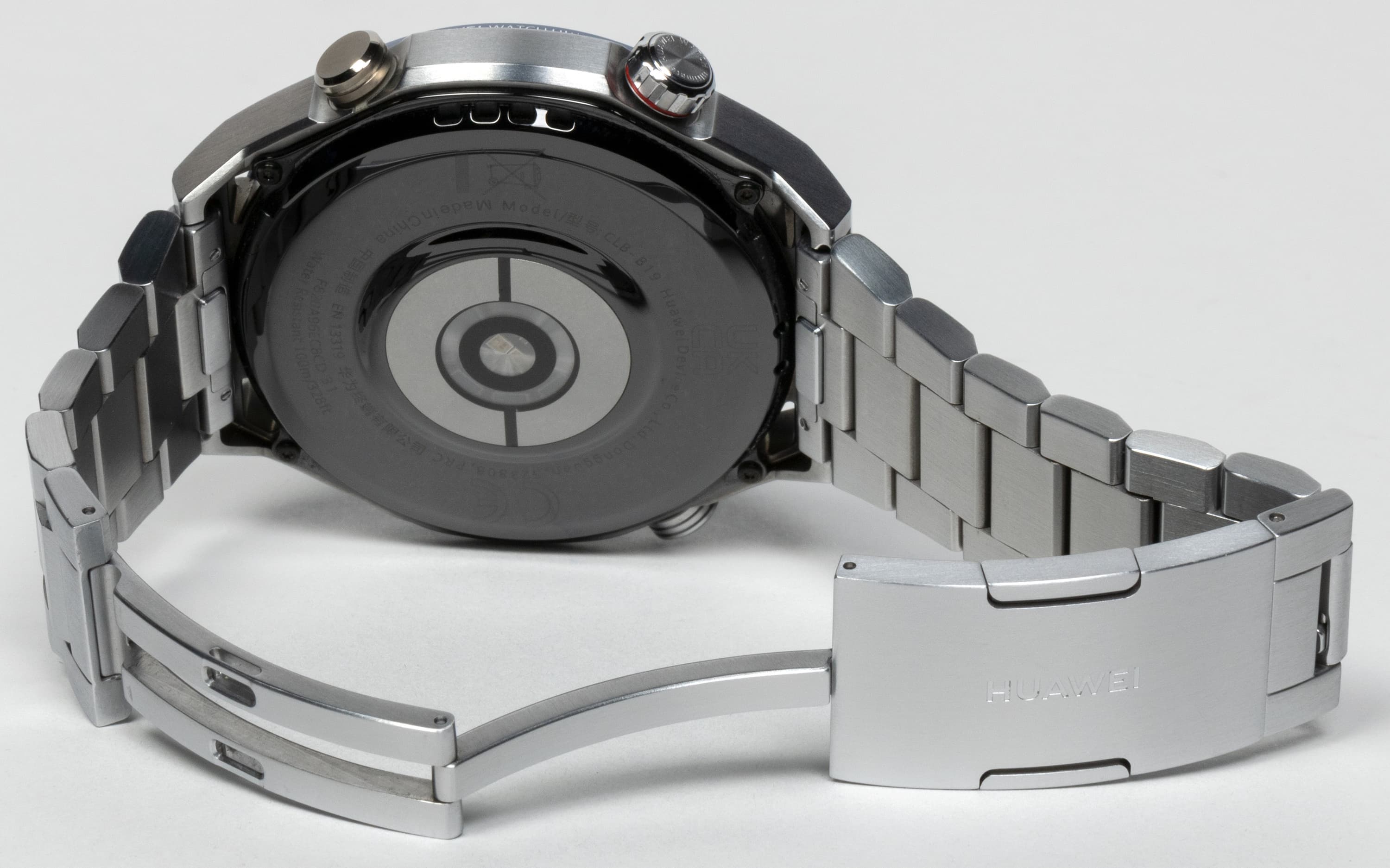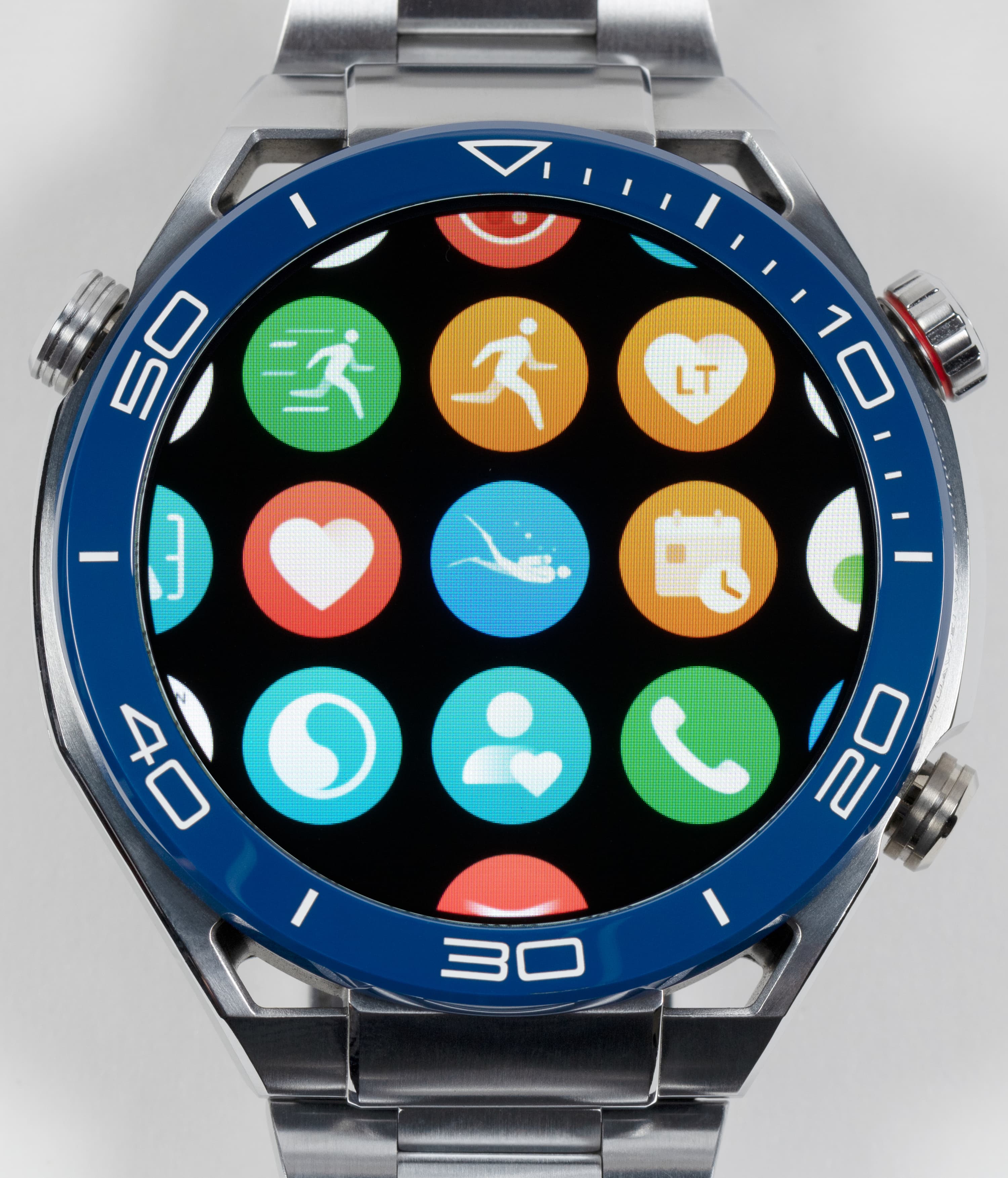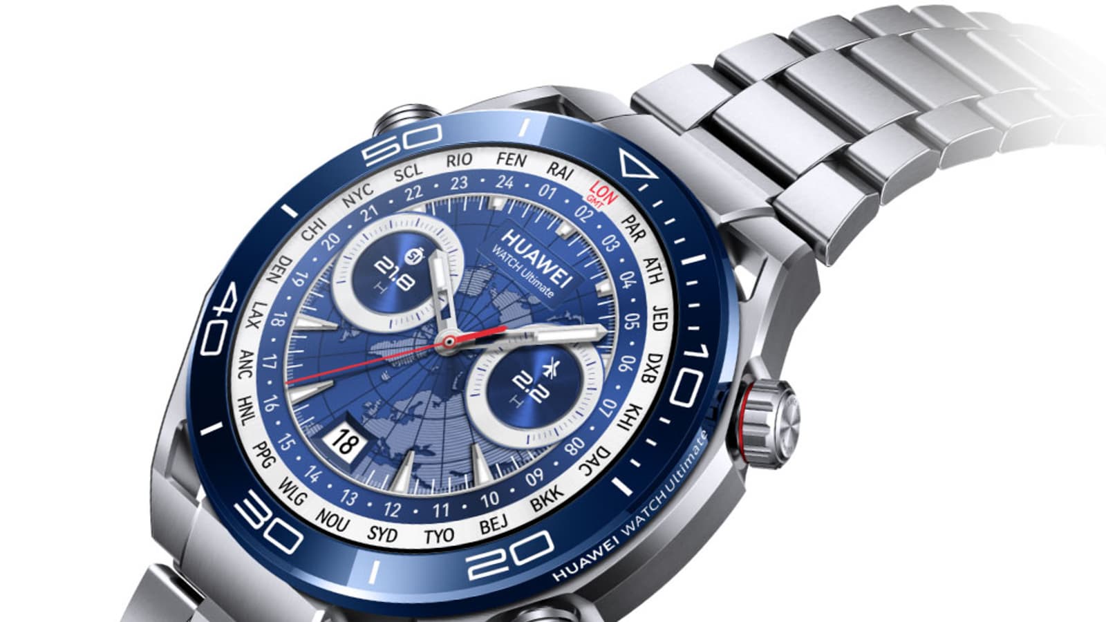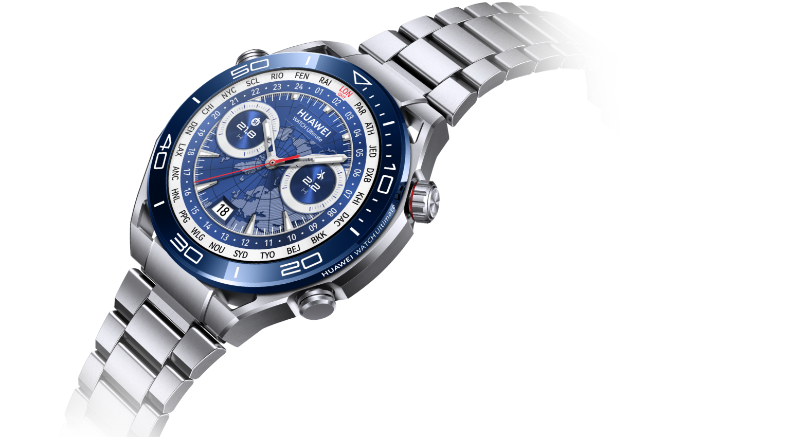 Часы Huawei Watch Ultimate выпускаются в двух цветовых вариантах — черном и сине-серебристом. У первого ремешок из каучука, у второго — из титановых звеньев. У нас на тестировании была сине-серебристая модель с титановым браслетом.