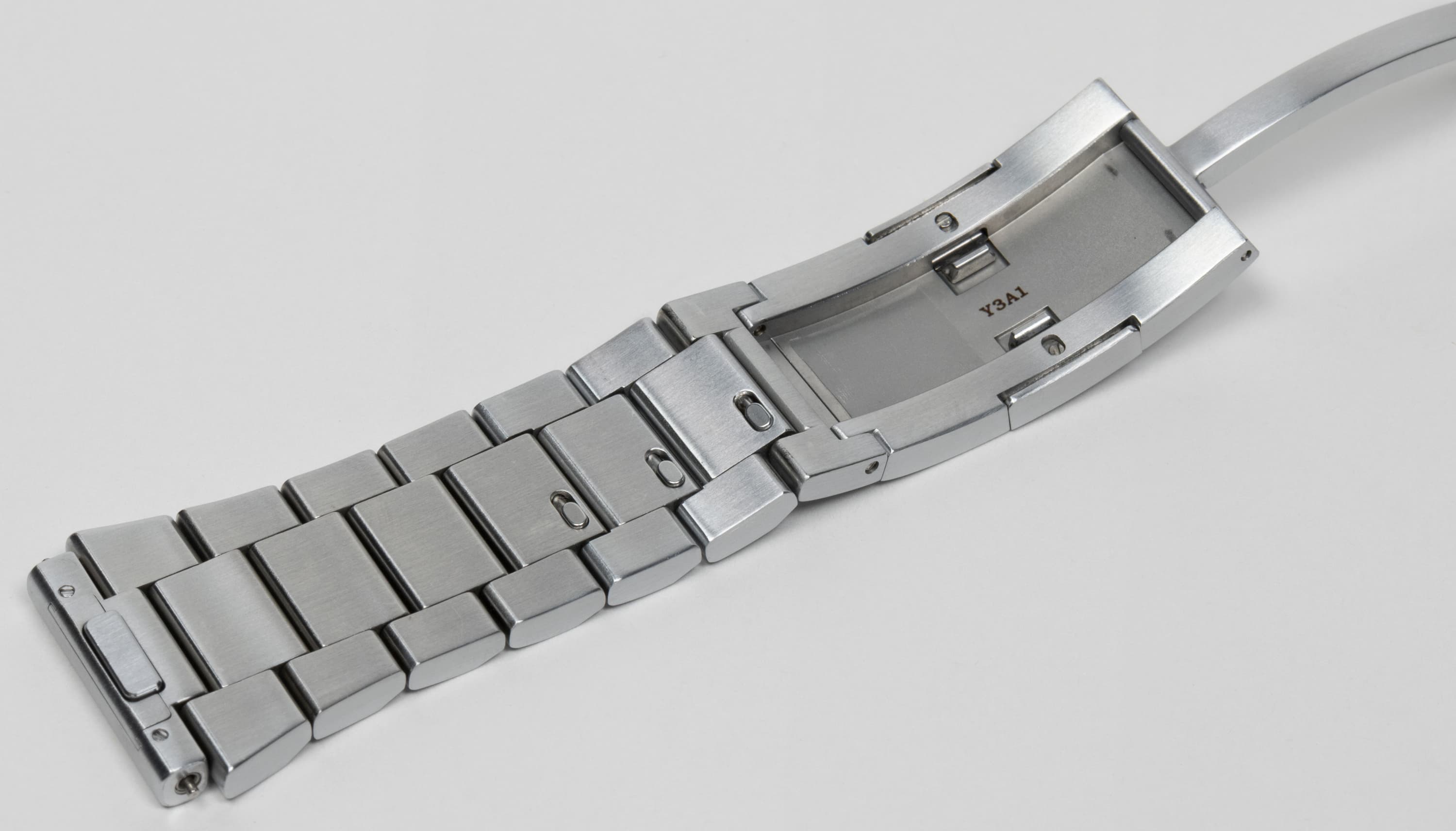 Теперь несколько слов о браслете. Он сделан из металлических звеньев и рассчитан на руку средней, скорее даже небольшой толщины. При этом четыре звена извлекаемые, то есть при желании можно приспособить браслет к еще более худой руке. Но хотелось бы нам посмотреть на взрослого мужчину, которому потребуется вытаскивать все четыре звена для комфортного ношения Watch Ultimate! Автор, обладатель очень худых запястий, ограничился извлечением двух звеньев, причем вполне можно было обойтись и одним. А многим более крупным коллегам автора не удалось надеть часы даже со всеми четырьмя звеньями — застежка просто не застегивалась.