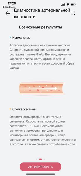 Еще одна возможность — диагностика артериальной жесткости. Это анализ эластичности (податливости) сосудов с помощью измерения скорости пульсовой волны. Правда, ранее мы уже встречались с измерением пульсовой волны, и здесь оно тоже представлено, но, видимо, производитель решил дополнить интерпретацию результатов еще одним параметром. Если раньше идея была только в том, чтобы выявлять аритмию (см. обзор Huawei Watch GT Cyber), теперь результатом становится еще и оценка жесткости артерий.