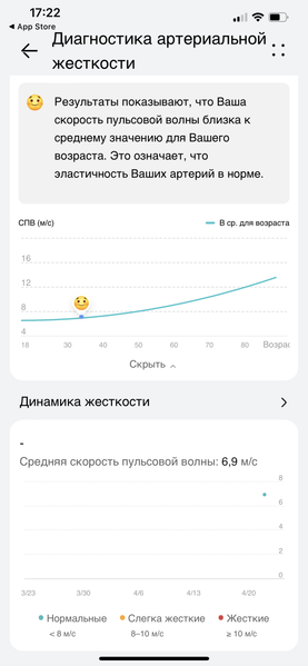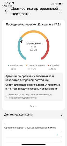 Не совсем понятно, почему жесткость артерий нельзя измерять автоматически, как это реализовано в случае с аритмией. Но в любом случае мы приветствуем появление новых оригинальных опций, связанных с анализом здоровья. Правда, во многом из-за новизны функции нам сложно оценить точность результатов. Мы дали часы трем людям разного возраста (в диапазоне от 35 и до 50 с небольшим), и у всех результат был примерно одинаковым — близко к верхней границе нормальной жесткости. Впрочем, доказать неточность измерения мы тоже не можем — просто потому, что данные не с чем сравнить.