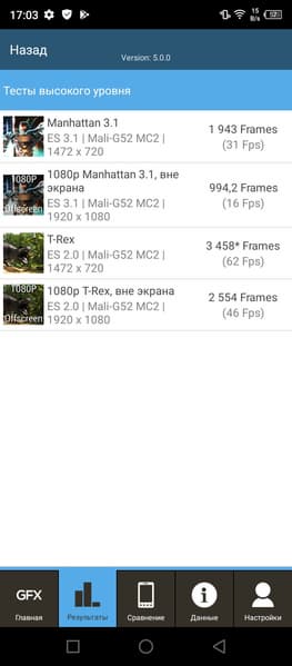 Все результаты, полученные нами при тестировании смартфона в самых свежих версиях популярных бенчмарков, мы для удобства свели в таблицы. В таблицу обычно добавляется несколько других аппаратов из различных сегментов, также протестированных на аналогичных последних версиях бенчмарков (это делается лишь для наглядной оценки полученных сухих цифр). К сожалению, в рамках одного сравнения нельзя представить результаты из разных версий бенчмарков, поэтому «за кадром» остаются многие достойные и актуальные модели — по причине того, что они в свое время проходили «полосу препятствий» на предыдущих версиях тестовых программ.
