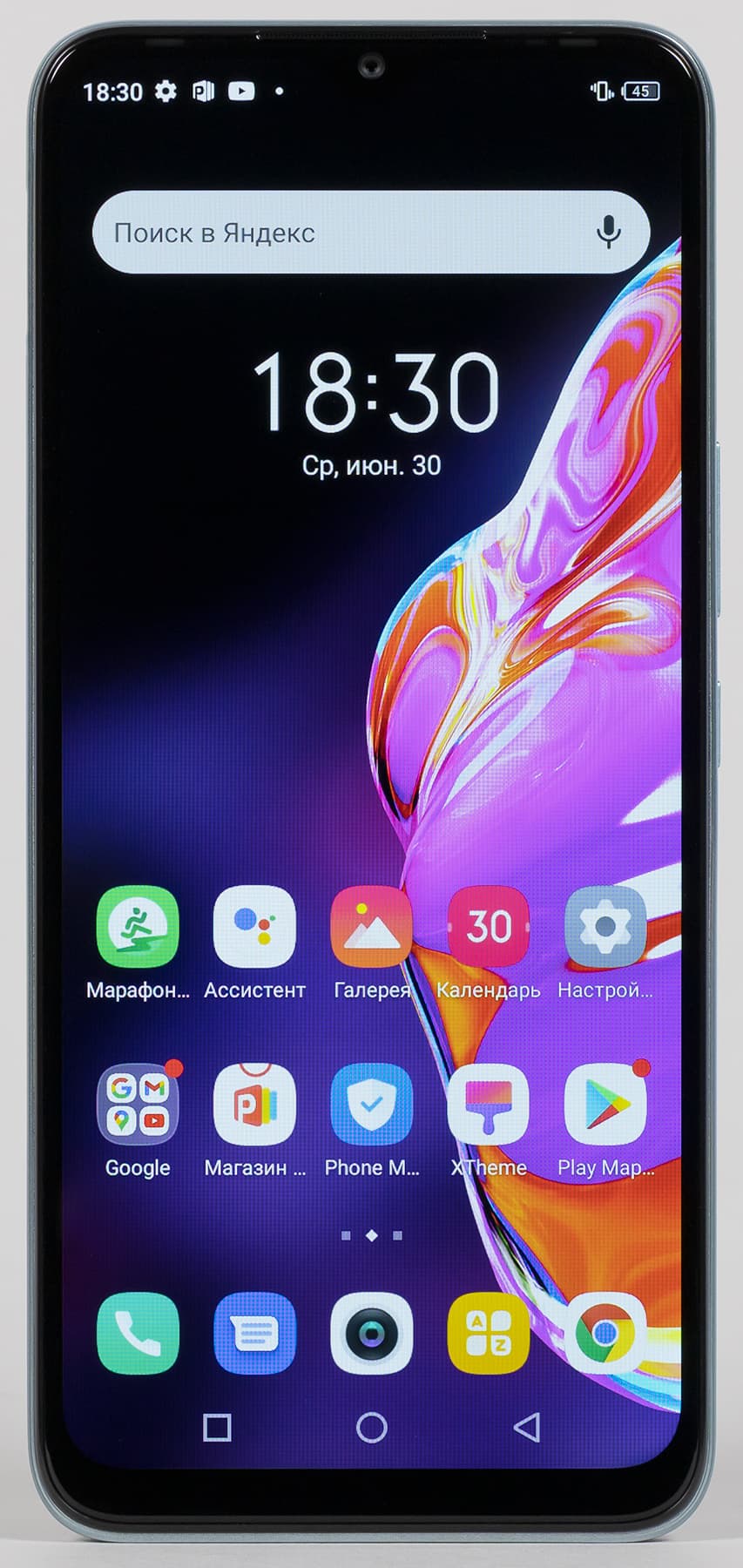 Экран у Infinix Hot 10S заметно темнее (яркость по фотографиям 99 против 109 у Nexus 7). Двоение отраженных объектов в экране Infinix Hot 10S очень слабое, это свидетельствует о том, что между слоями экрана (конкретнее между внешним стеклом и поверхностью ЖК-матрицы) нет воздушного промежутка (экран типа OGS — One Glass Solution). За счет меньшего числа границ (типа стекло/воздух) с сильно различающимися коэффициентами преломления такие экраны лучше смотрятся в условиях интенсивной внешней засветки, но вот их ремонт в случае потрескавшегося внешнего стекла обходится гораздо дороже, так как менять приходится экран целиком. На внешней поверхности экрана есть специальное олеофобное (жироотталкивающее) покрытие (по эффективности чуть лучше, чем у Nexus 7), поэтому следы от пальцев удаляются значительно легче, а появляются с меньшей скоростью, чем в случае обычного стекла.