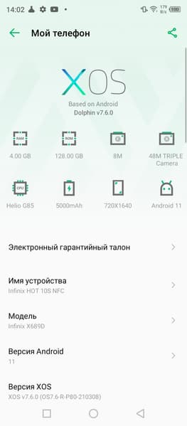 Infinix Hot 10s NFC работает на ОС Android 11-й версии с собственной фирменной оболочкой XOS 7.6. Оболочка «графически вдохновлена северным сиянием Исландии», как гласит описание. Это вполне типичный китайский интерфейс с массой разнообразных настроек, дополнительных функций и режимов. Например, можно скрывать от посторонних глаз часть информации на экране с помощью маски X-Proof. Есть игровой режим, его здесь называют Dir-link, также есть детский режим. Выдвижная виртуальная панель, управление жестами, разделение экрана, разделение аккаунтов соцсетей — всё присутствует. Магазин приложений Google Play и фирменные сервисы Google тоже на месте.