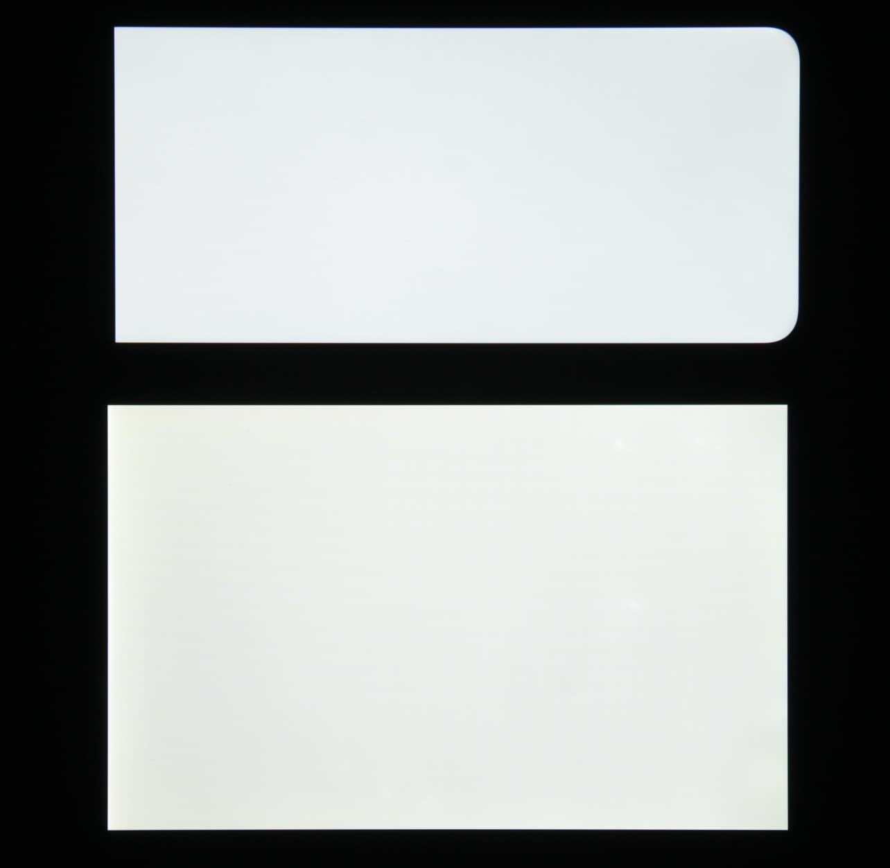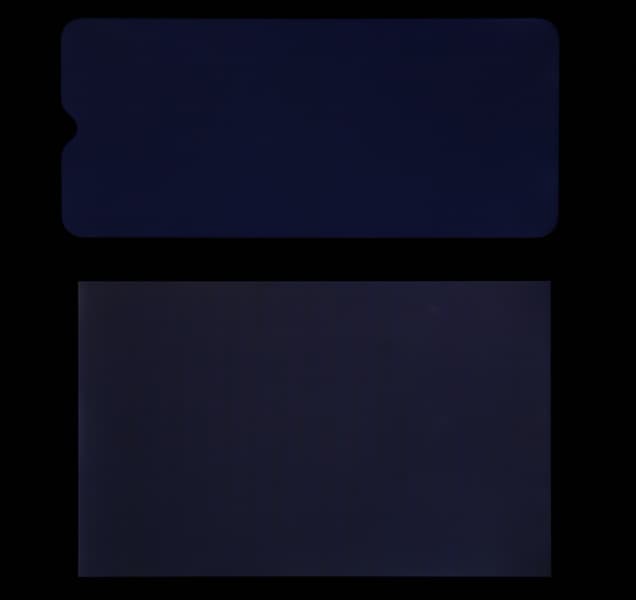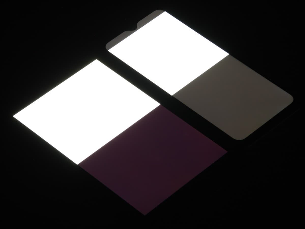Яркость под углом у экранов уменьшилась (как минимум в 5 раз, исходя из разницы в выдержке), но в случае Infinix Hot 10S яркость снизилась сильнее. Черное поле при отклонении по диагонали сильно высветляется, но остается условно нейтрально-серым (так это воспринимают глаза). Фотографии ниже это демонстрируют (яркость белых участков в перпендикулярном плоскости экранов направлении одинаковая!):