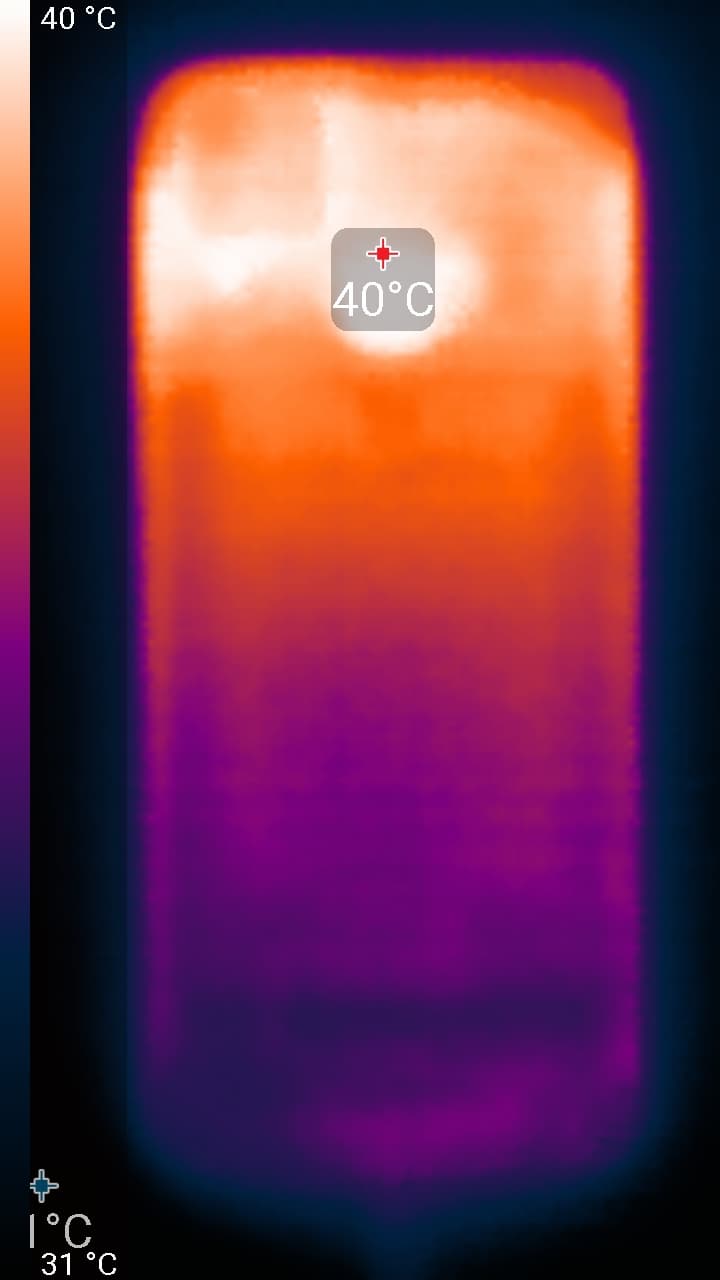Нагрев выше в верхней части аппарата, что, видимо, соответствует расположению микросхемы SoC. По данным теплокамеры, максимальный нагрев составил 40 градусов (при температуре окружающего воздуха в 24 градуса), это средний нагрев в данном тесте для современных смартфонов.