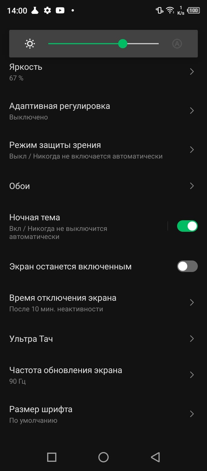 При ручном управлении яркостью и при выводе белого поля во весь экран максимальное значение яркости составило 450 кд/м². Максимальная яркость не очень высокая, но, учитывая отличные антибликовые свойства, что-то можно будет рассмотреть на экране даже в солнечный день вне помещения. Минимальное значение яркости — 4 кд/м², поэтому в полной темноте яркость можно понизить до комфортного значения. В наличии автоматическая регулировка яркости по датчику освещенности (он находится на фронтальной панели близко к ее верхнему краю правее решетки фронтального громкоговорителя). В автоматическом режиме при изменении внешних условий освещенности яркость экрана как повышается, так и понижается. Работа этой функции зависит от положения ползунка регулировки яркости: им пользователь может попытаться выставить желаемый уровень яркости в текущих условиях. Если не вмешиваться, то в полной темноте функция автояркости уменьшает яркость до 12 кд/м² (сойдет), в условиях освещенного искусственным светом офиса (примерно 550 лк) устанавливает на 180 кд/м² (нормально), а условно под прямыми лучами солнца повышает до 450 кд/м² (до максимума). Результат по умолчанию нас удовлетворил, но для эксперимента мы попробовали понизить яркость в полной темноте — подвинули ползунок чуть влево. Яркость стала ниже, но после цикла повышения внешней освещенности и ее снижения, все вернулось к тем же значениям, что были до вмешательства. Получается, что функция автоподстройки яркости хоть и работает адекватно, но не позволяет пользователю настраивать свою работу под индивидуальные требования. На любом уровне яркости значимая модуляция подсветки отсутствует, поэтому нет и никакого мерцания экрана.
