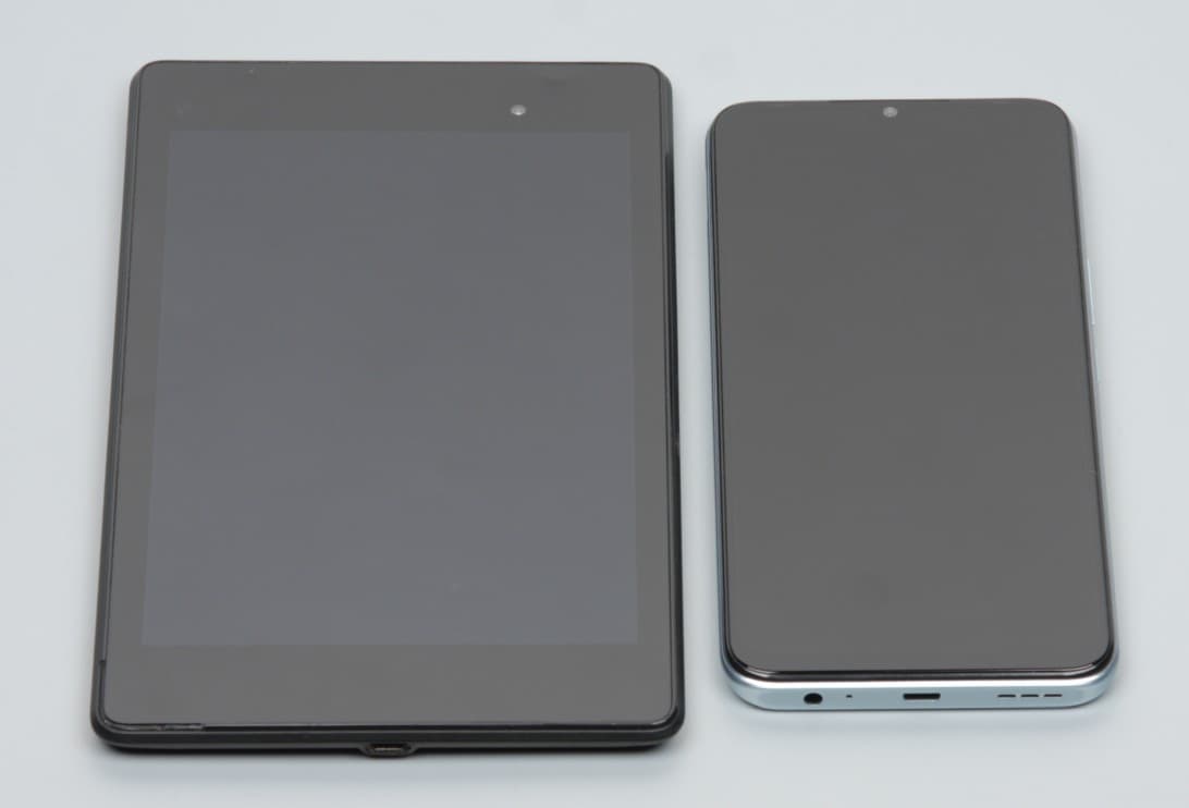 Лицевая поверхность экрана выполнена в виде стеклянной пластины с зеркально-гладкой поверхностью, устойчивой к появлению царапин. Судя по отражению объектов, антибликовые свойства экрана лучше, чем у экрана Google Nexus 7 (2013) (далее просто Nexus 7). Для наглядности приведем фотографию, на которой в выключенных экранах отражается белая поверхность (слева — Nexus 7, справа — Infinix Hot 10S, далее их можно различать по размеру):