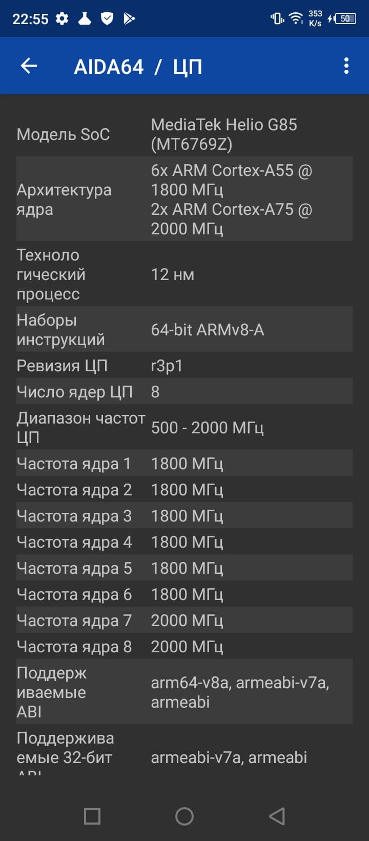 - SoC MediaTek Helio G85, 8 процессорных ядер (2×Cortex-A75 @2 ГГц + 6×Cortex-A55 @1,8 ГГц)