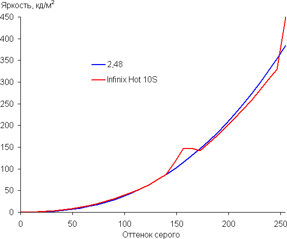 Контрастность (примерно в центре экрана) высокая — порядка 1350:1. Время отклика при переходе черный-белый-черный равно 21 мс (11 мс вкл. + 10 мс выкл.). Переход между полутонами серого 25% и 75% (по численному значению цвета) и обратно в сумме занимает 40 мс. В настройках экран можно включить режим с повышенной до 90 Гц частотой обновления, что приводит как минимум к увеличению плавности прокрутки списков в меню. Построенная по 32 точкам с равным интервалом по численному значению оттенка серого гамма-кривая не выявила завала ни в светах, ни в тенях. Показатель аппроксимирующей степенной функции равен 2,48, что выше стандартного значения 2,2, потому и изображение затемнено. При этом реальная гамма-кривая существенно отклоняется от степенной зависимости: