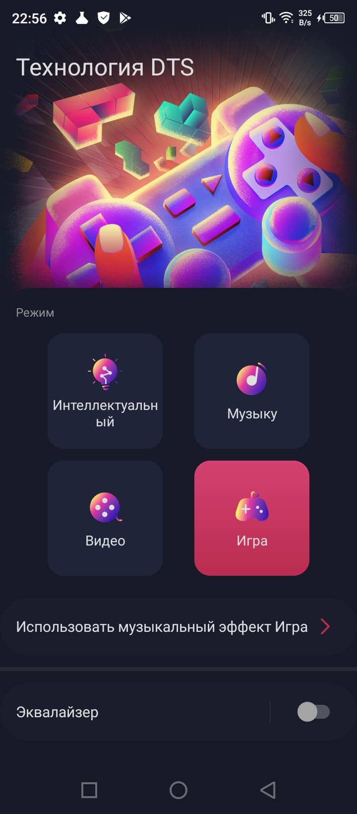 У смартфона нет стереодинамиков. Единственный громкоговоритель издает очень громкий, но не очень чистый звук, преимущественно на высоких частотах, звучание можно охарактеризовать как дешевое. Входящий звонок вы со столь громким динамиком не пропустите, но для мультимедийных функций он не подходит. В наушниках звучание тоже среднее. Есть настройки системы DTS и ручной пятиполосный эквалайзер. Не забыт и 3,5-миллиметровый аудиовыход для проводных наушников. Предустановлен собственный музыкальный проигрыватель, а не только неудобный YT Music.