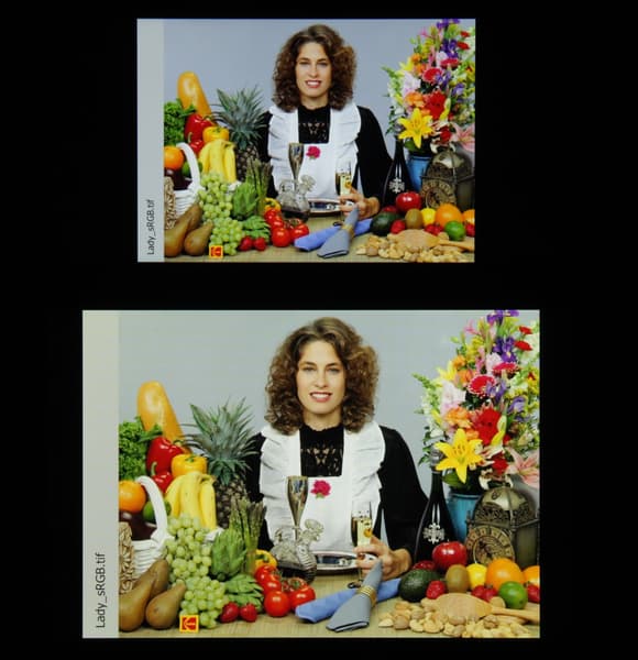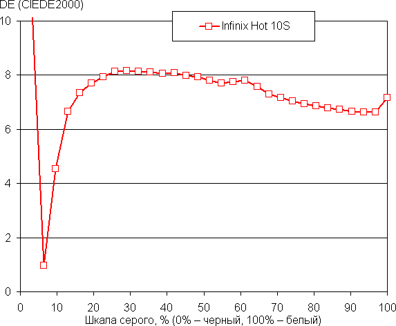 Баланс оттенков на шкале серого компромиссный, так как цветовая температура существенно выше стандартных 6500 К. Однако отклонение от спектра абсолютно черного тела (ΔE) на шкале серого ниже 10, что для потребительского устройства считается приемлемым показателем. При этом цветовая температура и ΔE мало изменяются от оттенка к оттенку — это положительно сказывается на визуальной оценке цветового баланса. (Самые темные области шкалы серого можно не учитывать, так как там баланс цветов не имеет большого значения, да и погрешность измерений цветовых характеристик на низкой яркости большая.)
