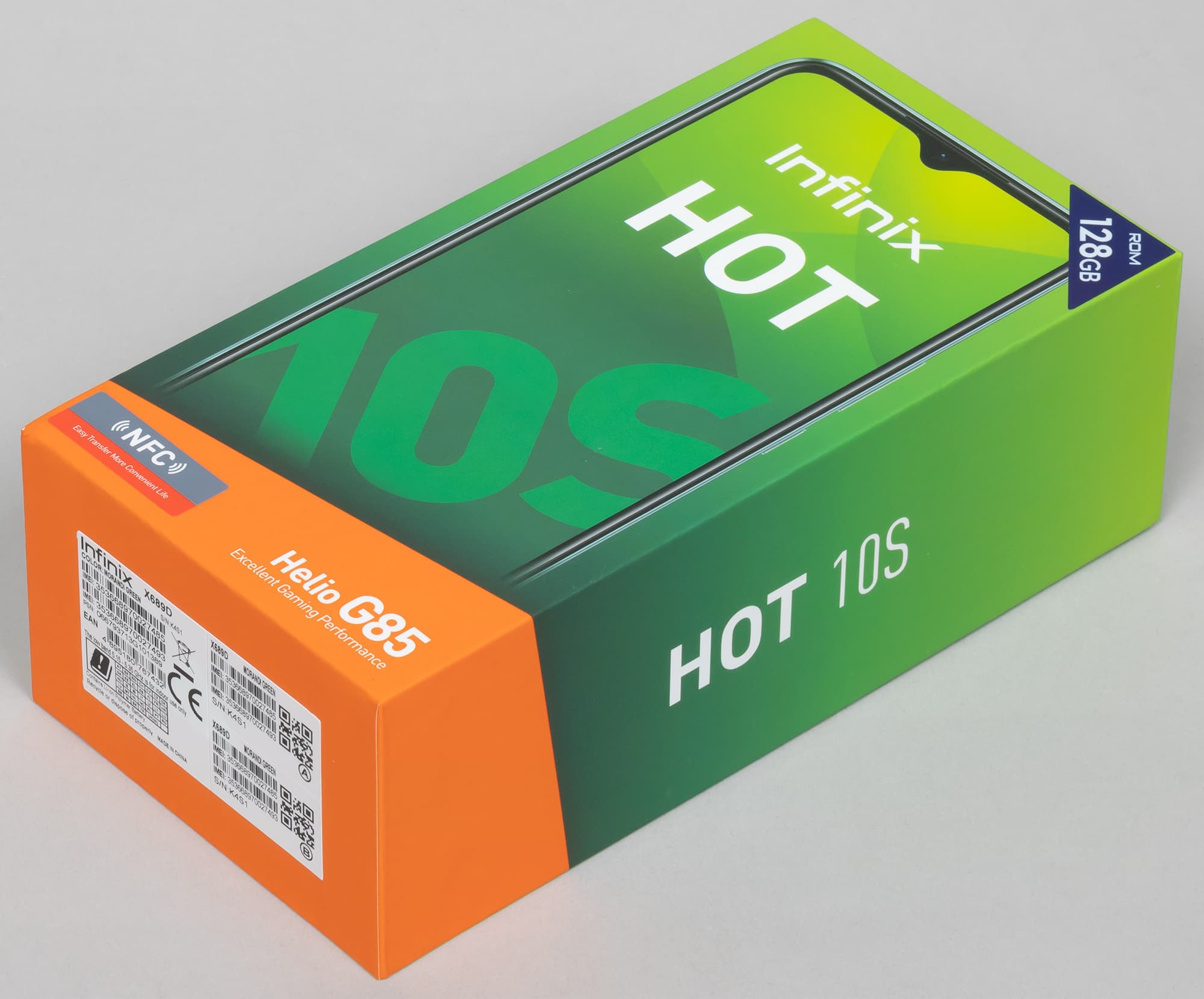 Infinix Hot 10s NFC поставляется в ярко оформленной коробке из твердого картона.
