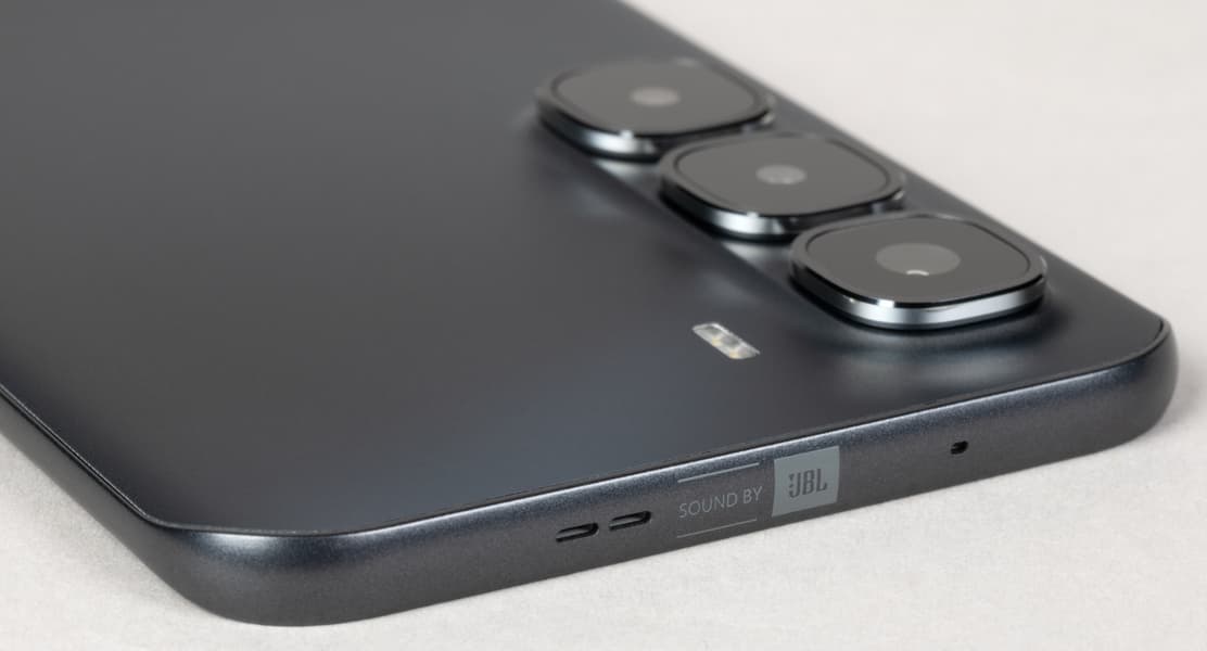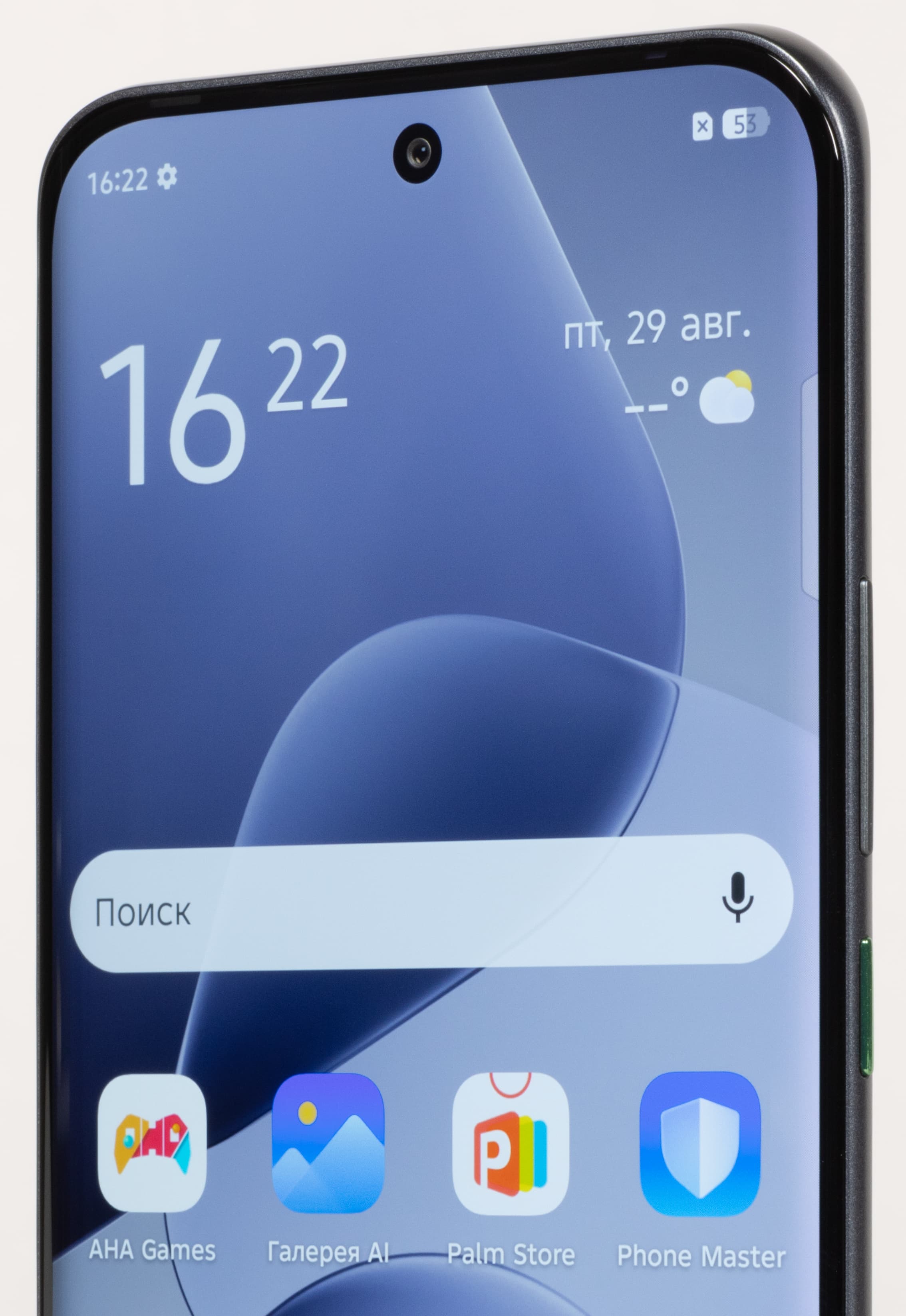 Одиночный глазок фронтальной камеры установлен за круглым вырезом в матрице экрана. Защитное стекло здесь — Corning Gorilla Glass 7i с загнутыми краями. Рамка вокруг дисплея узкая. Оптический сканер отпечатка пальца установлен под экраном в нижней части.