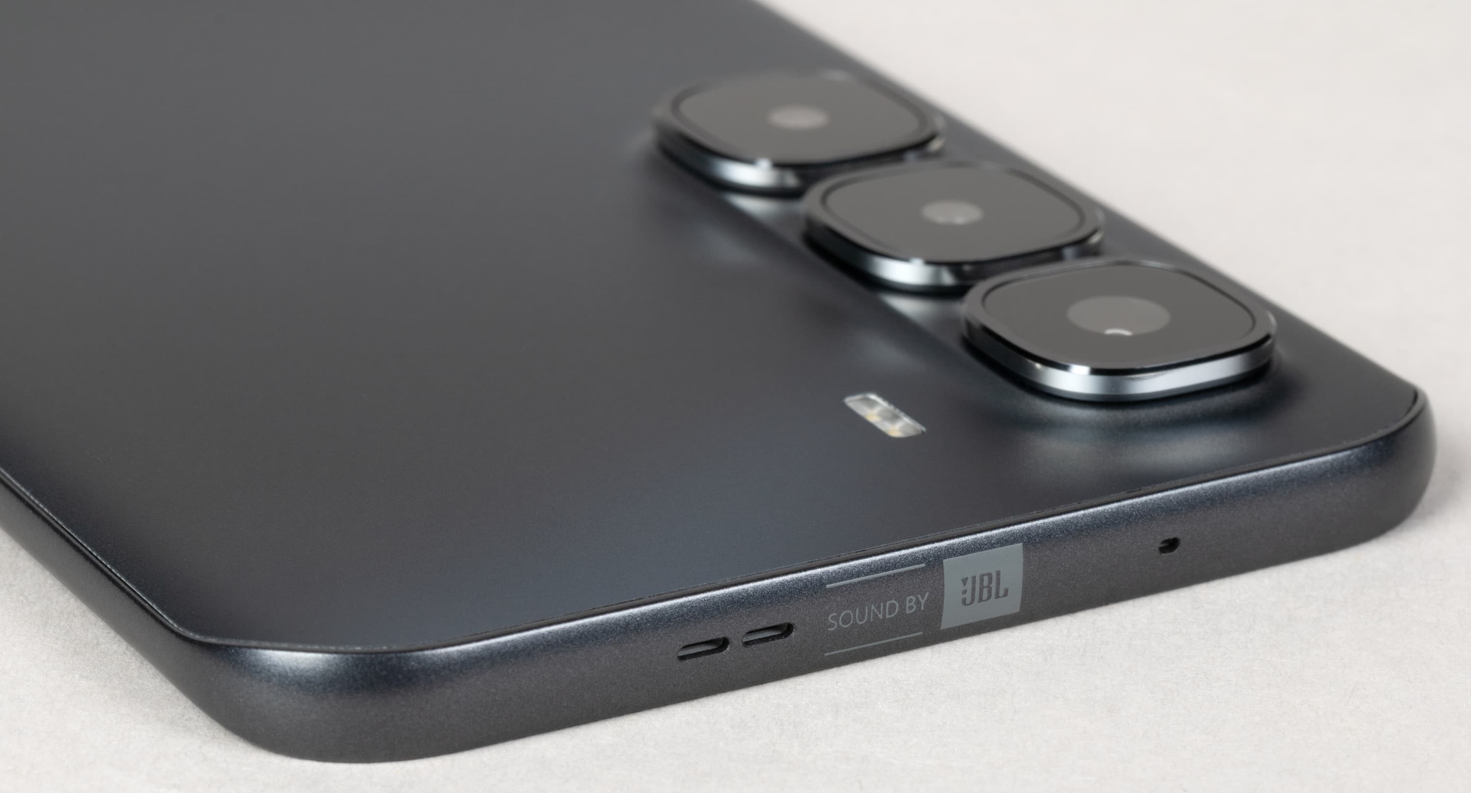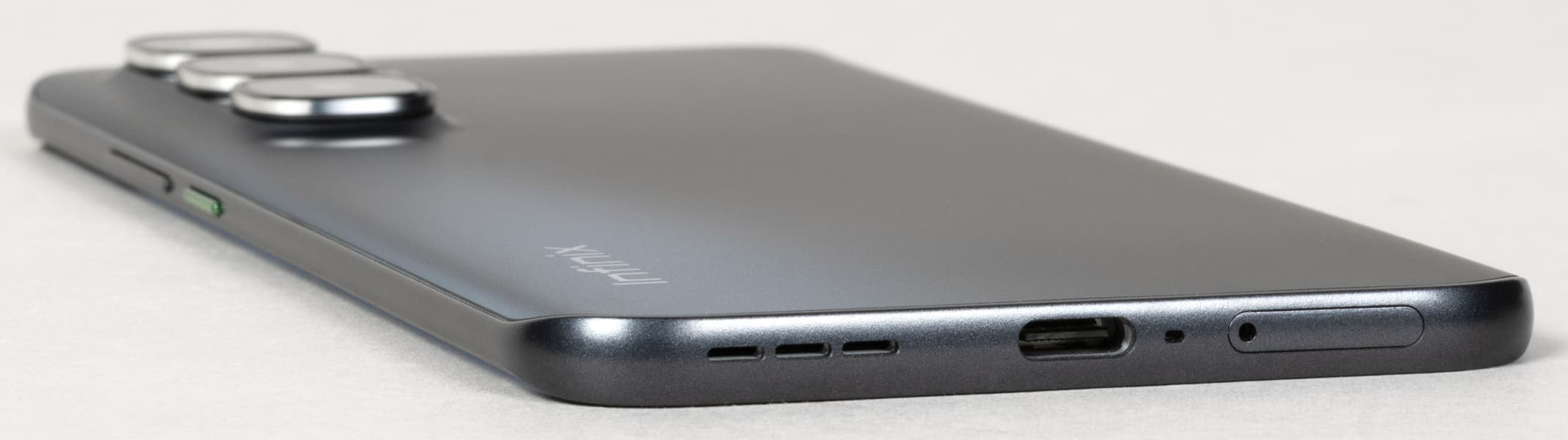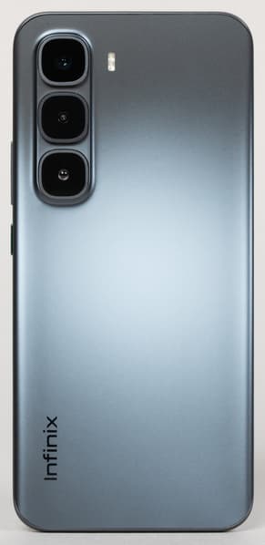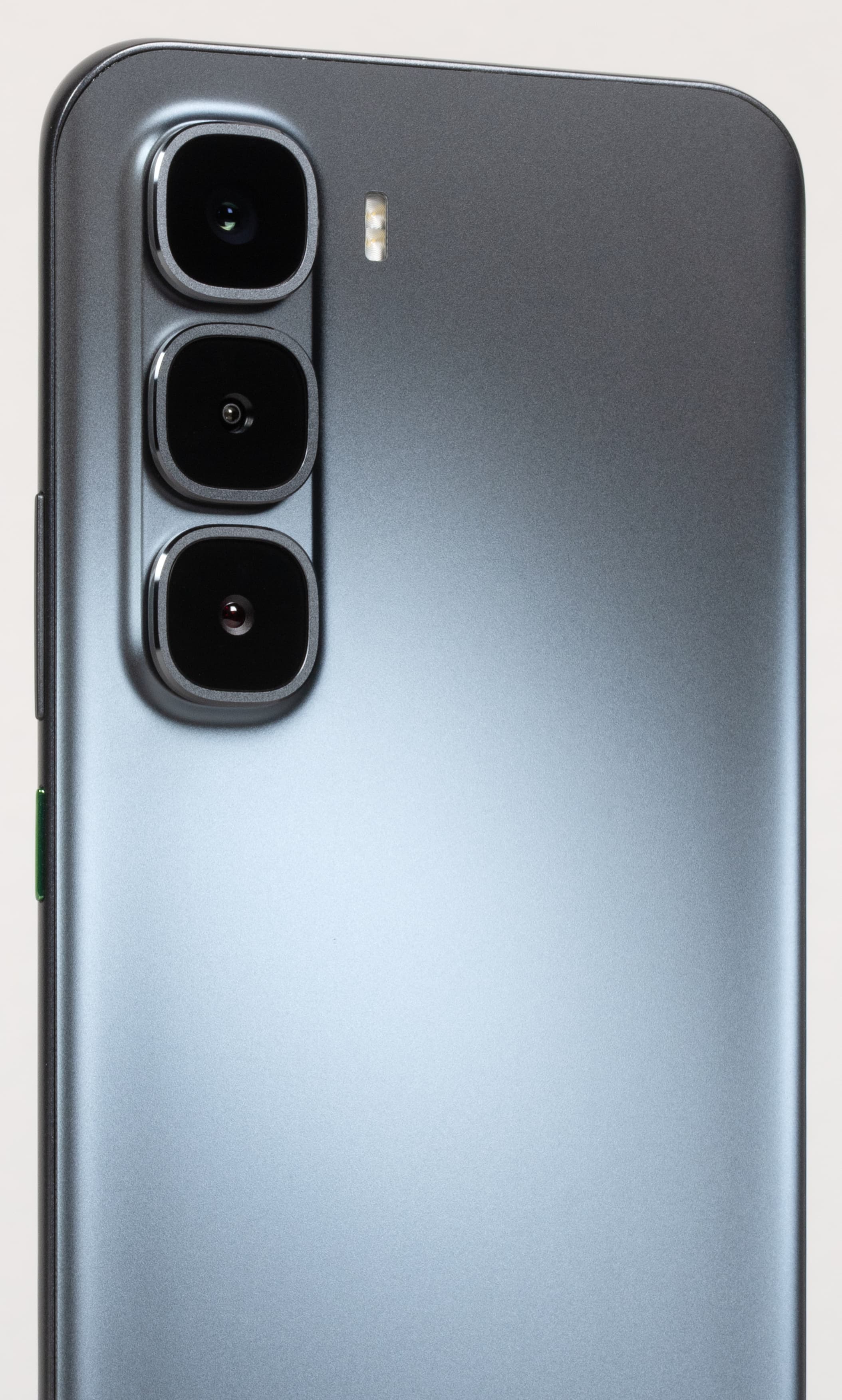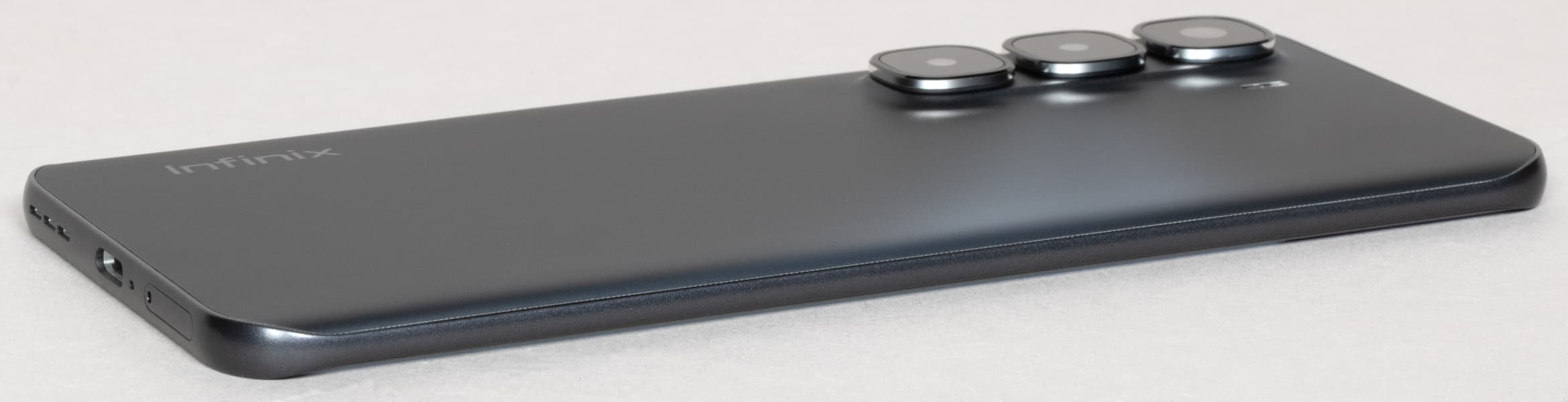 Infinix Hot 60 Pro+ оформлен в характерном стиле с обтекаемыми формами, тыльная и фронтальная поверхности загибаются к боковинам, образуя в том числе экран-«водопад». Корпус очень тонкий (без учета выступающих камер, естественно) и легкий, и с такими округлыми боковинами он не очень надежно удерживается в руке. Эргономика принесена в жертву красоте: смартфон привлекательный, но столь малая толщина в реальной жизни не нужна, толстый корпус лучше заполняет ладонь, чем тонкая пластина.