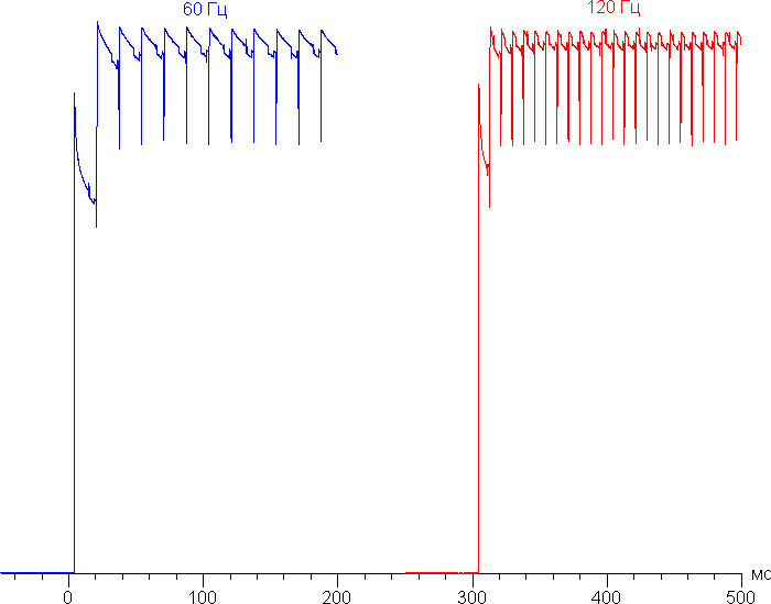 Переключение состояния элементов матрицы выполняется практически мгновенно, но на фронте включения может присутствовать ступенька шириной примерно 17 мс в случае частоты обновления экрана 60 Гц или примерно 8 мс (120 Гц). Например, так выглядит зависимость яркости от времени при переходе от черного к белому (режим 60 Гц и 120 Гц):