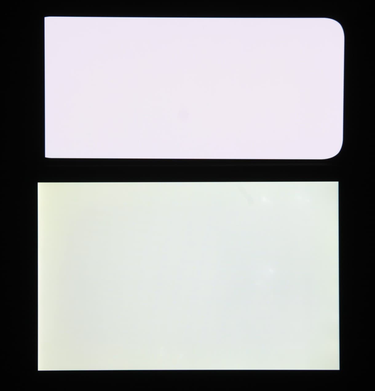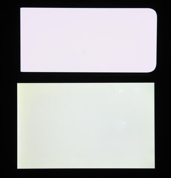 Экран характеризуется великолепными углами обзора. Яркость под углом у обоих экранов заметно уменьшается (если сравнивать с Nexus 7), но в случае смартфона падение яркости выражено гораздо меньше. В итоге, даже если установить формально одинаковую яркость, то экран этого смартфона визуально выглядит гораздо более ярким (в сравнении с ЖК-экранами), так как на экран мобильного устройства часто приходится смотреть как минимум под небольшим углом. Правда, у смартфона белый цвет при отклонении на большие углы приобретает едва заметный сине-зеленый оттенок, но черный цвет остается просто черным под любыми углами. Он настолько черный, что параметр контрастности в данном случае неприменим. Для сравнения приведем фотографии, на которых на экран смартфона и экран второго участника (Nexus 7; снизу — Nexus 7, сверху — смартфон) выведены одинаковые изображения, при этом яркость экранов изначально установлена примерно на 200 кд/м², а цветовой баланс на фотоаппарате принудительно переключен на 6500 К.