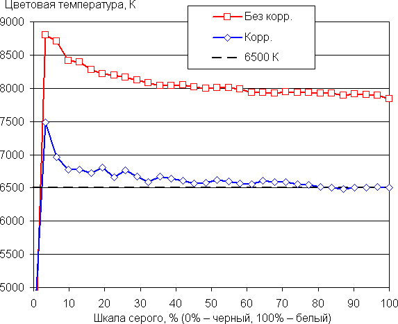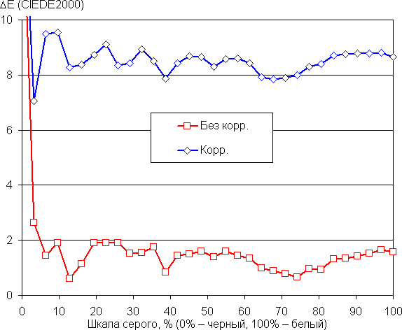 (Самые темные области шкалы серого в большинстве случаев можно не учитывать, так как там баланс цветов не имеет большого значения, да и погрешность измерений цветовых характеристик на низкой яркости большая.) В этом устройстве есть возможность скорректировать цветовой баланс регулировки цветовой температуры, но при ее снижении растет ΔE — результат на графиках с подписью Корр.