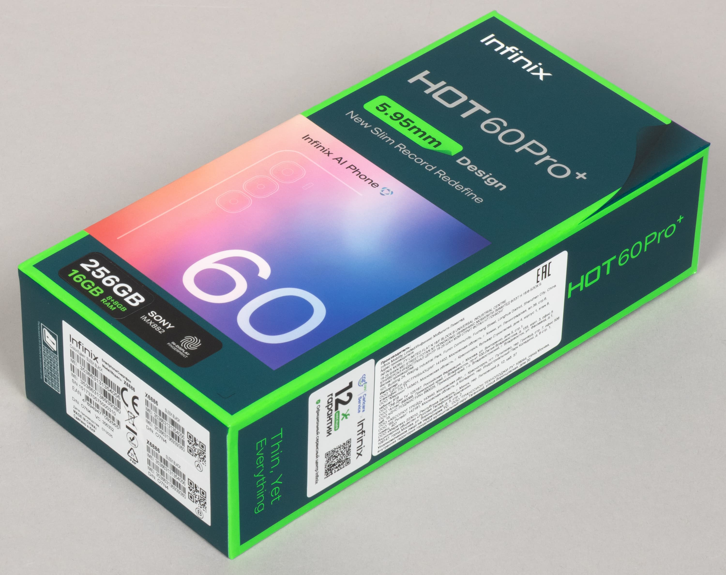 Infinix Hot 60 Pro+ поставляется в картонной коробке стандартной формы с ярким оформлением.