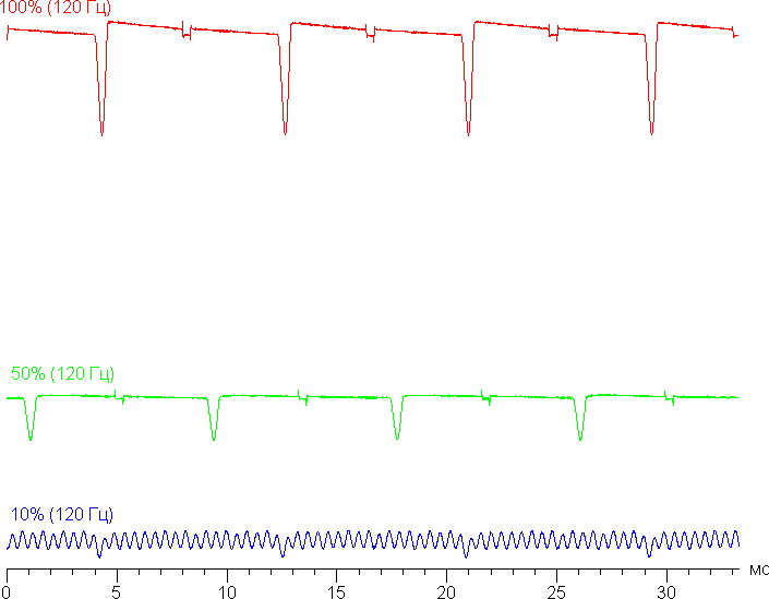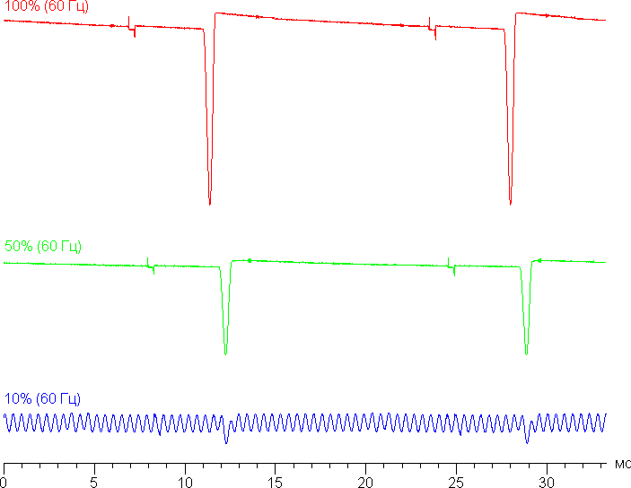 На любом уровне яркости присутствует значимая модуляция с частотой 60, 120 или 144 Гц. На рисунках ниже приведены зависимости яркости (вертикальная ось) от времени (горизонтальная ось) для нескольких значений настройки яркости. Сначала для режима с частотой обновления 60 Гц:
