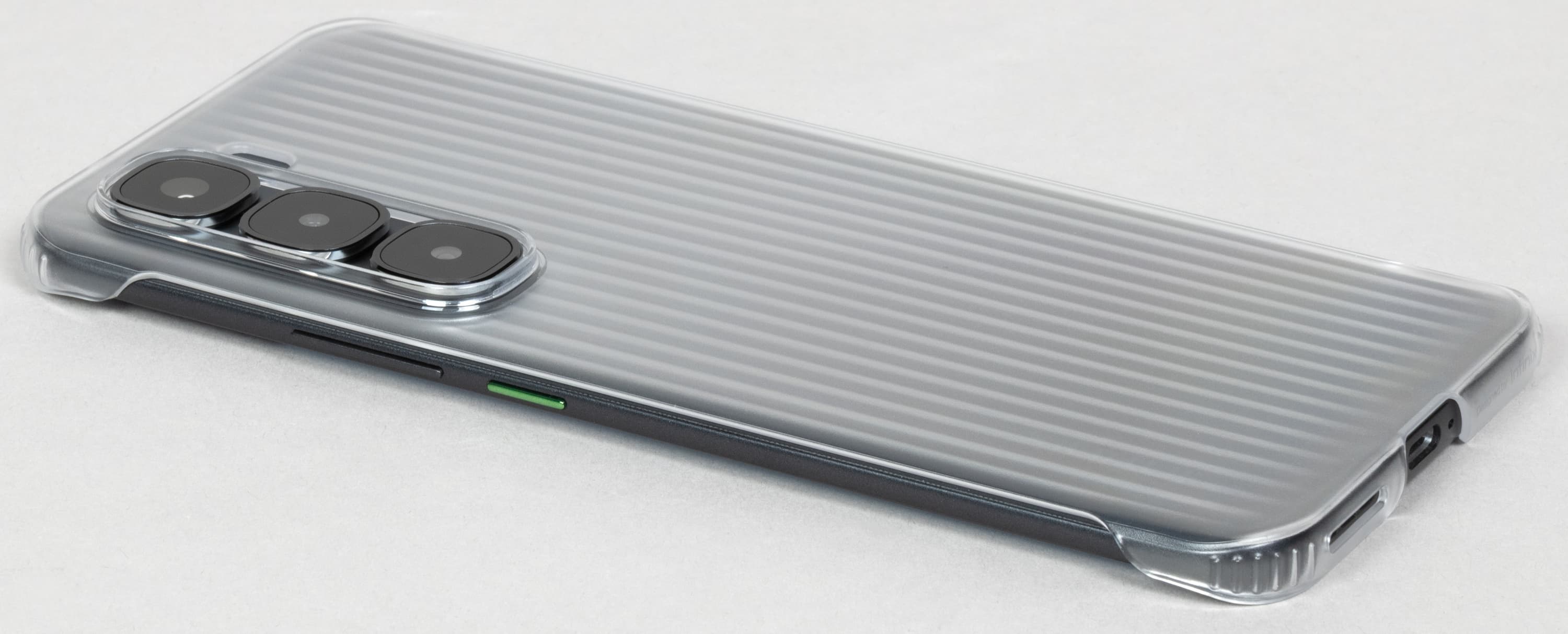 Чехол в комплекте не гибкий силиконовый, а твердый полуматовый, частично прикрывающий грани и торцы. Он увеличивает толщину, способствуя более удобному удержанию смартфона в руке.