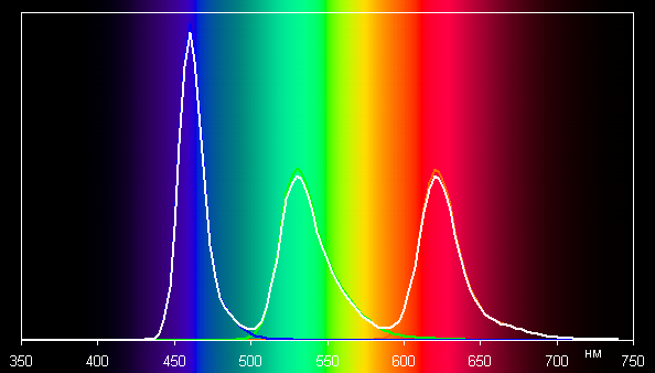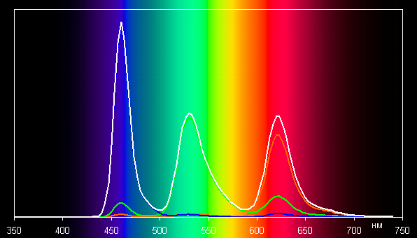 В первом случае спектры компонент (то есть спектры чистых красного, зеленого и синего цветов) очень хорошо разделены: