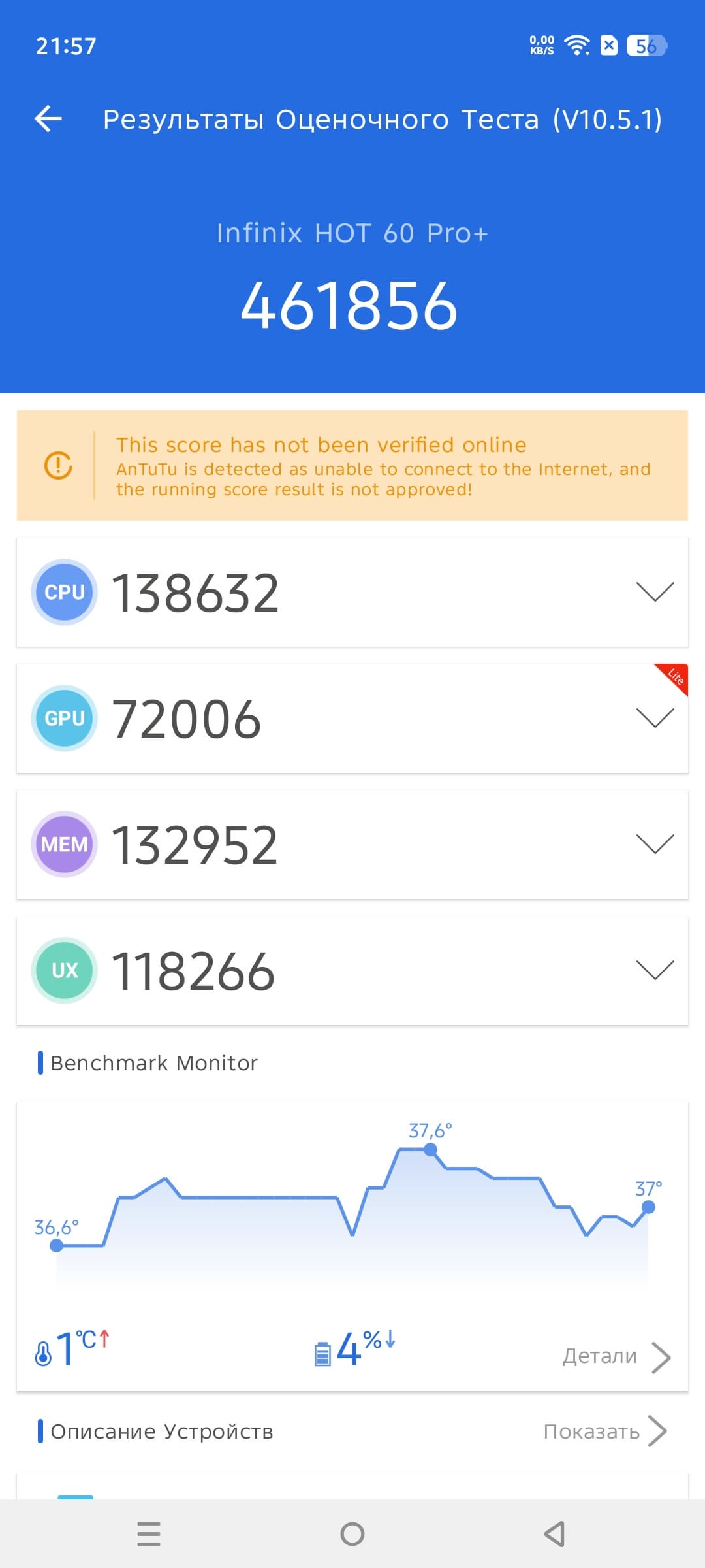 Смартфон Infinix Hot 60 Pro+ работает на SoC Mediatek Helio G200, которая производится по нормам 6-нанометрового техпроцесса. Это решение бюджетного уровня, набирающее в AnTuTu менее 500 тысяч баллов. Уровень ниже среднего, такой производительности хватает для большинства повседневных организационных задач, но не для требовательных игр. Да и видеосъемка поддерживается лишь в 2.5K с 30 кадрами в секунду. В принципе, логично: недорогой смартфон с упором на имиджевую составляющую получил недорогую аппаратную платформу. Зато и греется при нагрузках он несильно, уровень тротлинга, особенно GPU, гораздо лучше, чем у флагманов.