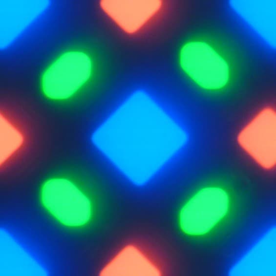 В этом экране используется матрица AMOLED — активная матрица на органических светодиодах. Полноцветное изображение создается с помощью субпикселей трех цветов — красного (R), зеленого (G) и синего (B), но красных и синих субпикселей в два раза меньше (синий субпиксель состоит из двух частей), что можно обозначить как RGBG. Это подтверждается фрагментом микрофотографии: