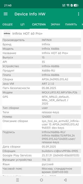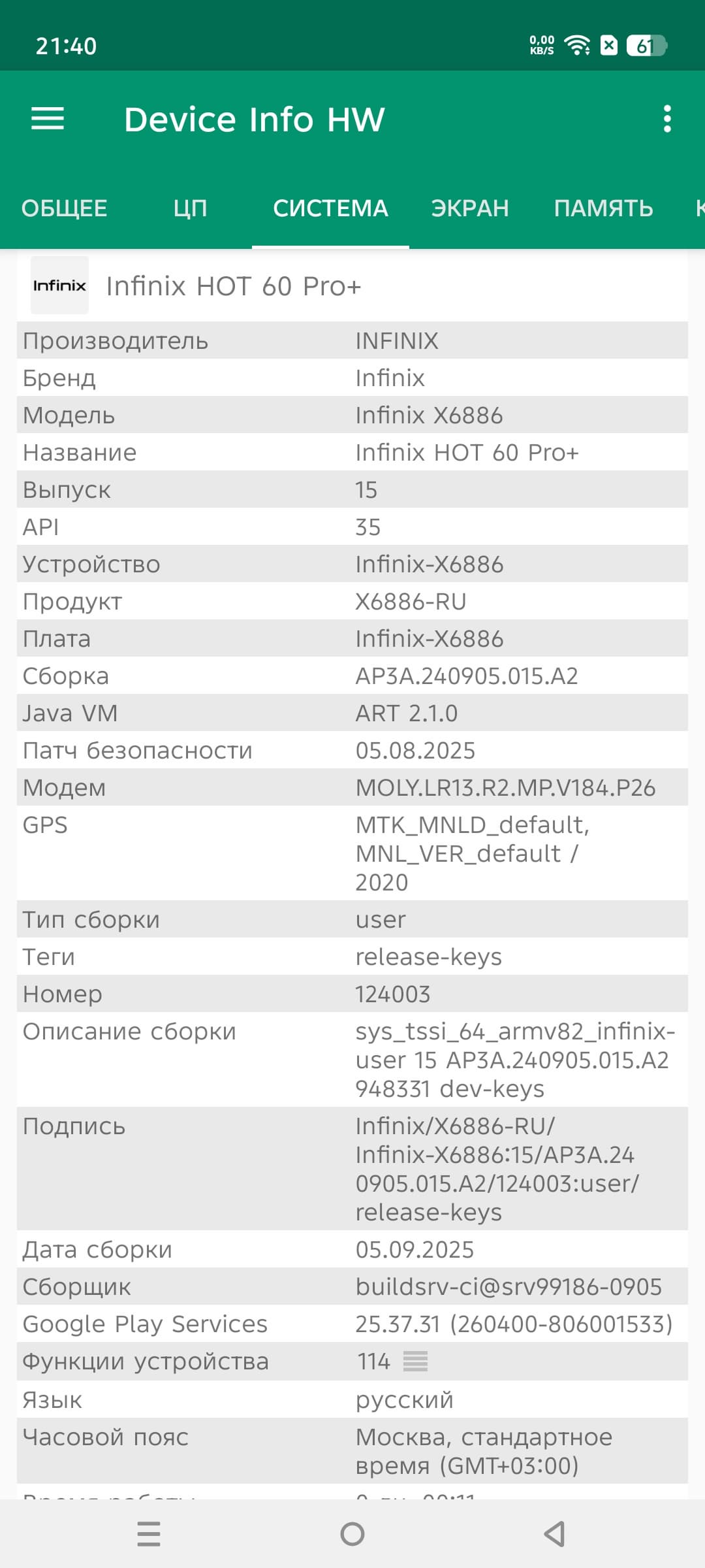 Смартфон Infinix Hot 60 Pro+ поддерживает мобильные сети вплоть до 4G, два диапазона Wi-Fi 6 и Bluetooth 5.4, NFC. Поддержки e-SIM нет. На практике в пределах городской черты московского региона аппарат демонстрирует уверенную работу в беспроводных сетях, не теряет связь, быстро восстанавливает связь после вынужденного обрыва. Все необходимые встроенные датчики вплоть до гироскопа на месте. Также приятно, что датчик приближения физический, а не виртуальный.