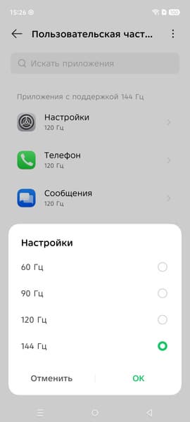 По факту частота обновления повышается максимум до 120 Гц во всех испробованных нами приложениях, за исключением штатного приложения Настройки. Как следует из списка, включить режим 144 Гц можно еще в трех приложениях:
