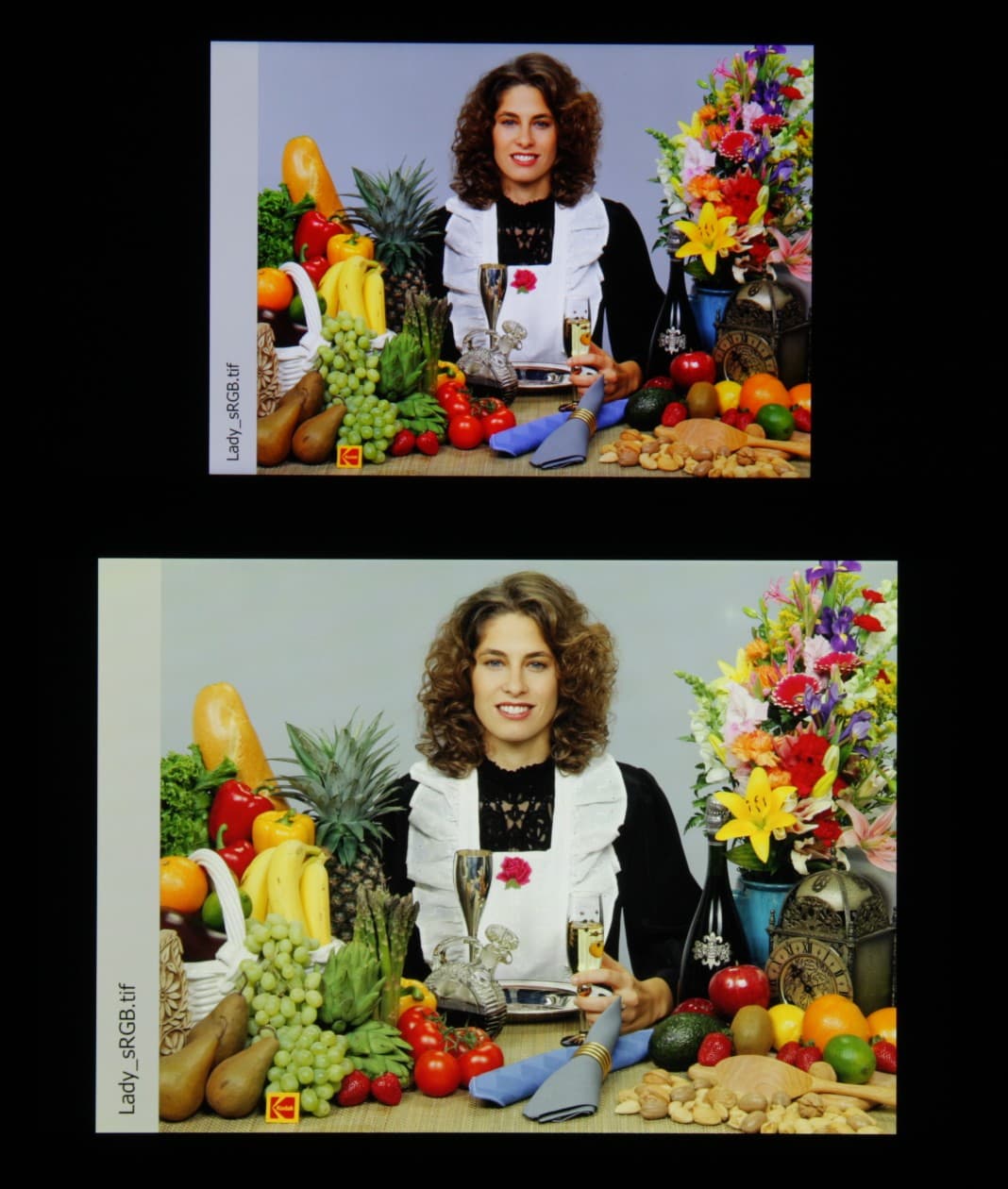 Баланс оттенков на шкале серого компромиссный, так как цветовая температура существенно выше стандартных 6500 К. Однако отклонение от спектра абсолютно черного тела (ΔE) на шкале серого ниже 3, что для потребительского устройства считается отличным показателем. При этом цветовая температура и ΔE мало изменяются от оттенка к оттенку — это положительно сказывается на визуальной оценке цветового баланса. (Самые темные области шкалы серого можно не учитывать, так как там баланс цветов не имеет большого значения, да и погрешность измерений цветовых характеристик на низкой яркости большая.)