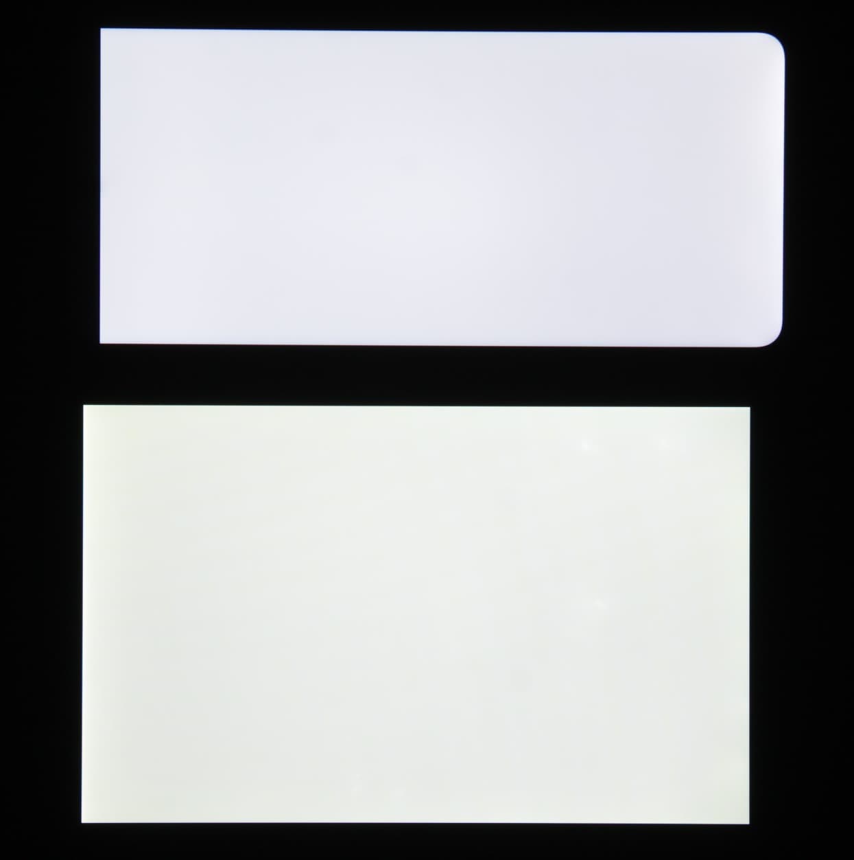 Яркость под углом у экранов уменьшилась (как минимум в 5 раз, исходя из разницы в выдержке), но в случае Infinix Note 10 Pro яркость снизилась сильнее. Черное поле при отклонении по диагонали сильно высветляется, и приобретает слегка красноватый оттенок. Фотографии ниже это демонстрируют (яркость белых участков в перпендикулярном плоскости экранов направлении одинаковая!):