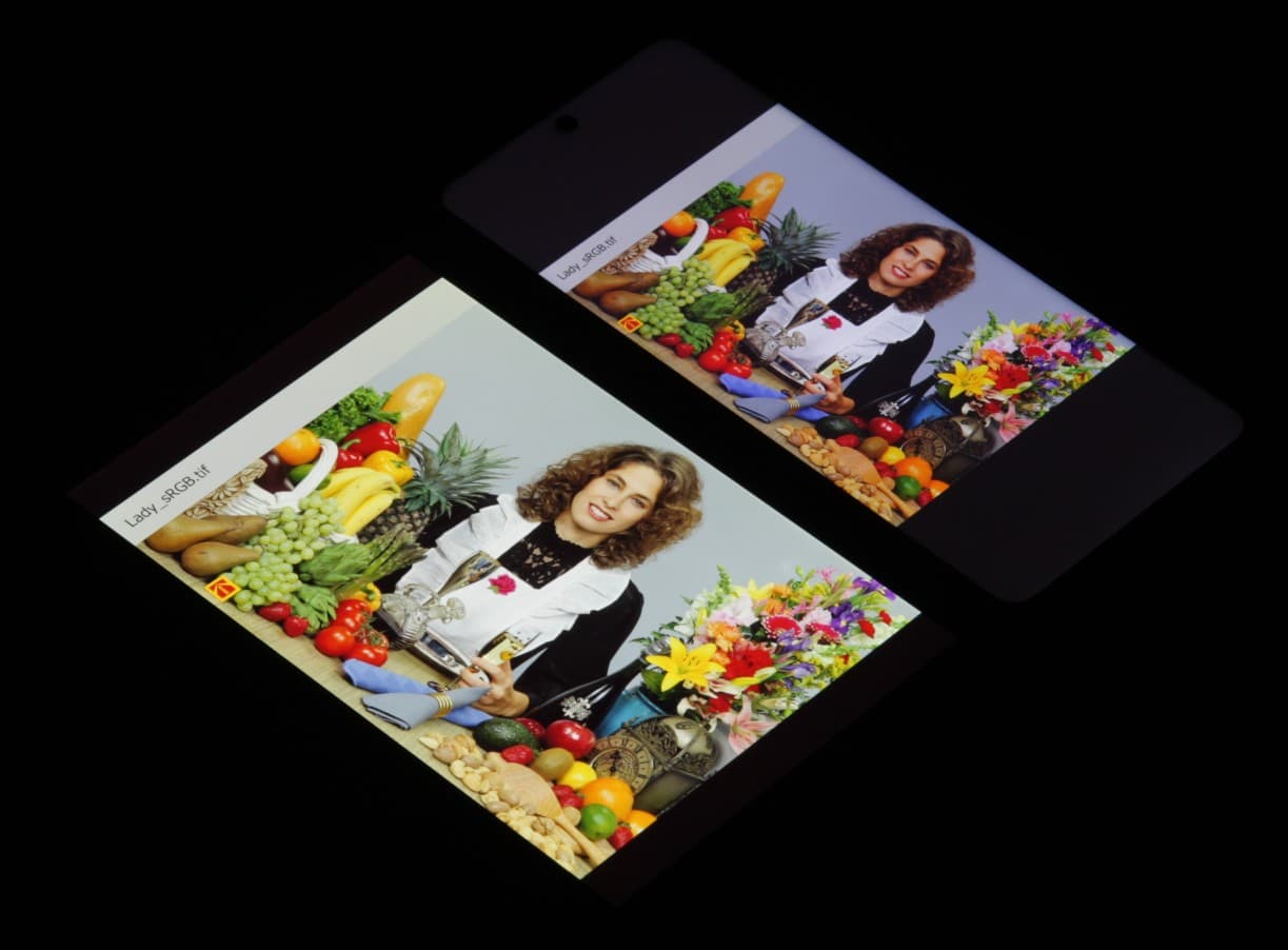 Экран имеет хорошие углы обзора без значительного сдвига цветов даже при больших отклонениях взгляда от перпендикуляра к экрану и без инвертирования оттенков. Для сравнения приведем фотографии, на которых на экраны Infinix Note 10 Pro и Nexus 7 выведены одинаковые изображения, при этом яркость экранов изначально установлена примерно на 200 кд/м², а цветовой баланс на фотоаппарате принудительно переключен на 6500 К.