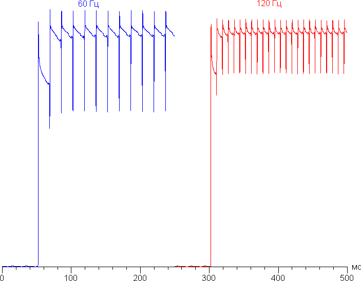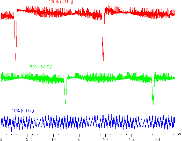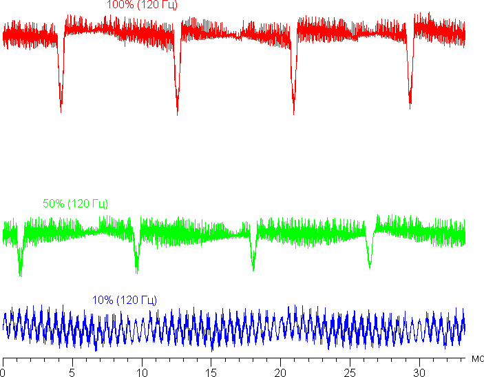 На высоком и среднем уровне яркости присутствует значимая модуляция с частотой примерно 60 или 120 Гц. На рисунках ниже приведены зависимости яркости (вертикальная ось) от времени (горизонтальная ось) для нескольких значений настройки яркости. Сначала для режима с частотой обновления 60 Гц: