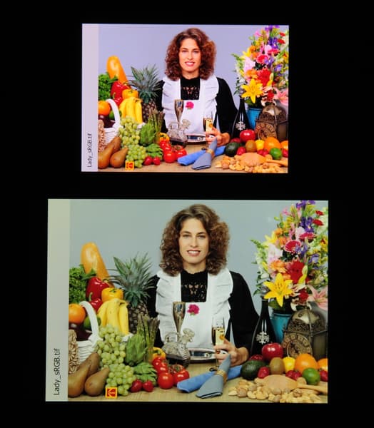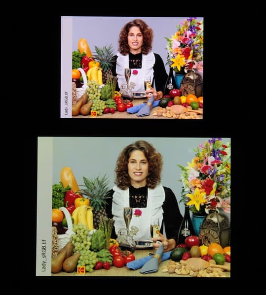 Цвета на экране смартфона перенасыщены (обратите внимание на помидоры, бананы, салфетку и оттенок лица), а цветовой баланс заметно отличается. Напомним, что фотография не может служить надежным источником сведений о качестве цветопередачи и приводится только для условной наглядной иллюстрации. В частности, выраженный красноватый оттенок белого и серого полей, присутствующий на фотографиях экрана смартфона, при перпендикулярном взгляде визуально отсутствует, что подтверждается аппаратными тестами с помощью спектрофотометра. Причина в том, что спектральная чувствительность матрицы фотоаппарата неточно совпадает с этой характеристикой человеческого зрения.