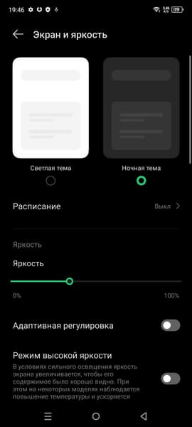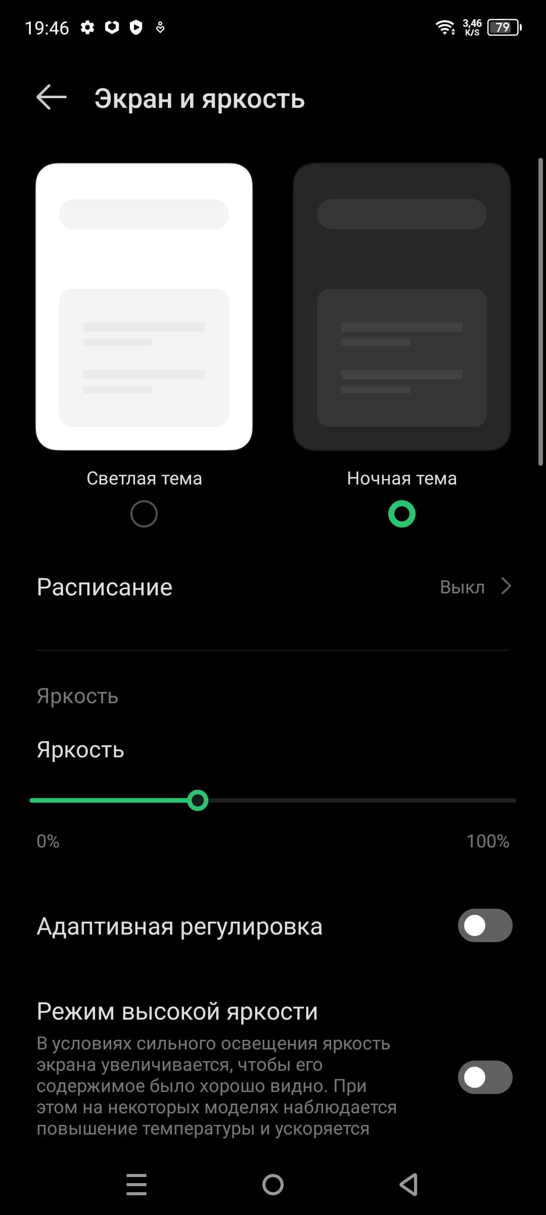 При ручном управлении яркостью и при выводе белого поля во весь экран максимальное значение яркости составило примерно 480 кд/м² в обычных условиях, на очень ярком свету при включенной опции Режим высокой яркости оно повышается до 680 кд/м². Максимальная яркость очень высокая. В данном случае чем меньше площадь белого на экране, тем он светлее, то есть фактическая максимальная яркость белых участков будет почти всегда еще выше. В итоге, учитывая отличные антибликовые свойства, читаемость днем на солнце, должна быть на приемлемом уровне, а темная тема не только экономит заряд аккумулятора, но способствует лучшей разборчивости информации на экране в условиях высокой освещенности. Минимальное значение яркости при ручном управлении — 5 кд/м², то есть пониженный уровень яркости без проблем позволяет использовать устройство даже в полной темноте. Есть автоматическая регулировка яркости по датчику освещенности (он находится на фронтальной панели близко к ее верхнему краю правее решетки фронтального громкоговорителя). В автоматическом режиме при изменении внешних условий освещенности яркость экрана как повышается, так и понижается. Работа этой функции зависит от положения ползунка регулировки яркости: им пользователь может попытаться выставить желаемый уровень яркости в текущих условиях. Если оставить все по умолчанию, то в полной темноте функция автояркости уменьшает яркость до 4 кд/м² (темновато), в условиях освещенного искусственным светом офиса (примерно 550 лк) устанавливает на 120 кд/м² (нормально), а условно под прямыми лучами солнца повышает до 680 кд/м² (до максимума, так и нужно; опция Режим высокой яркости включена). Результат по умолчанию нас не удовлетворил, поэтому мы попробовали повысить яркость в полной темноте. Яркость стала выше, но после цикла повышения внешней освещенности и ее снижения, все вернулось к тем же значениям, что были до вмешательства. Получается, что функция автоподстройки яркости работает более-менее адекватно, но не позволяет пользователю настраивать свою работу под индивидуальные требования.