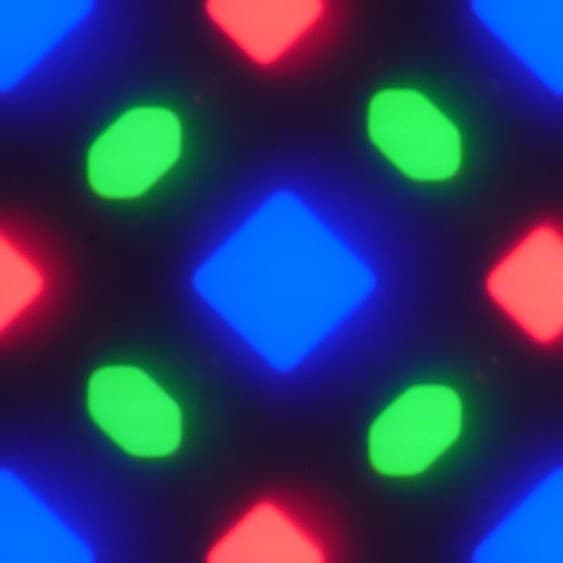 В этом экране используется матрица AMOLED — активная матрица на органических светодиодах. Полноцветное изображение создается с помощью субпикселей трех цветов — красного (R), зеленого (G) и синего (B), но красных и синих субпикселей в два раза меньше, что можно обозначить как RGBG. Это подтверждается фрагментом микрофотографии: