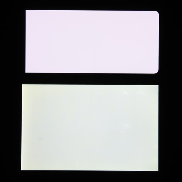 Экран характеризуется великолепными углами обзора. Правда, белый цвет при отклонении на большие углы приобретает легкий сине-зеленый оттенок, но черный цвет остается просто черным под любыми углами. Он настолько черный, что параметр контрастности в данном случае просто неприменим. Для сравнения приведем фотографии, на которых на экраны смартфона и второго участника (Nexus 7; снизу — Nexus 7, сверху — смартфон, далее их можно различать по размеру) выведены одинаковые изображения, при этом яркость экранов изначально установлена примерно на 200 кд/м², а цветовой баланс на фотоаппарате принудительно переключен на 6500 К.