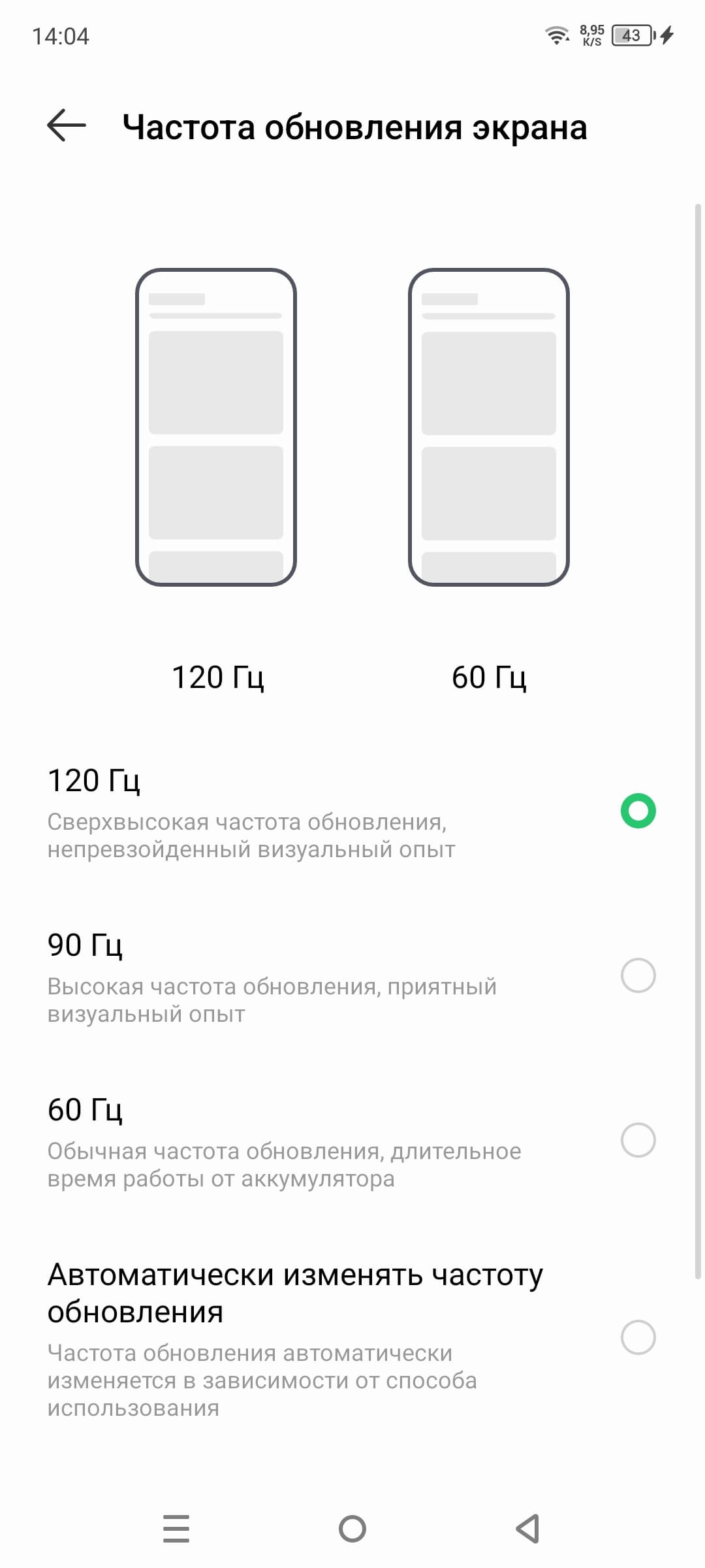 По факту в режим 90 Гц смартфон не переключается, но в случае 120 Гц плавность прокрутки заметно повышается. Посмотрим, изменится ли при этом характер модуляции. Режим с частотой обновления 120 Гц: