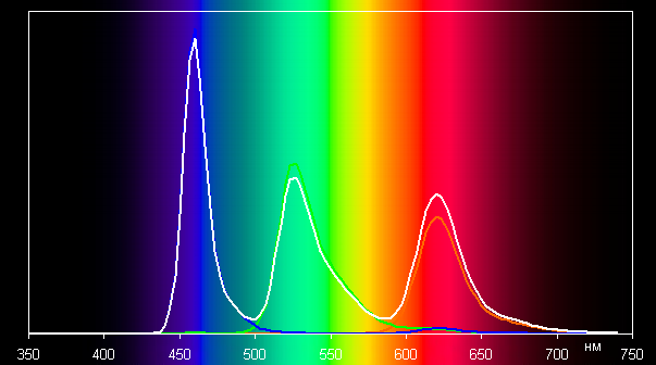 Спектры компонент (то есть спектры чистых красного, зеленого и синего цветов) очень хорошо разделены: