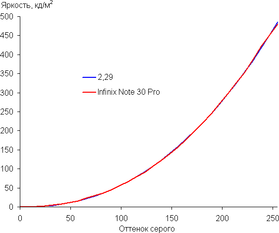 Построенная по 32 точкам с равным интервалом по численному значению оттенка серого гамма-кривая не выявила завала ни в тенях, ни в светах. Показатель аппроксимирующей степенной функции равен 2,29, что немного выше стандартного значения 2,2, при этом реальная гамма-кривая мало отклоняется от степенной зависимости: