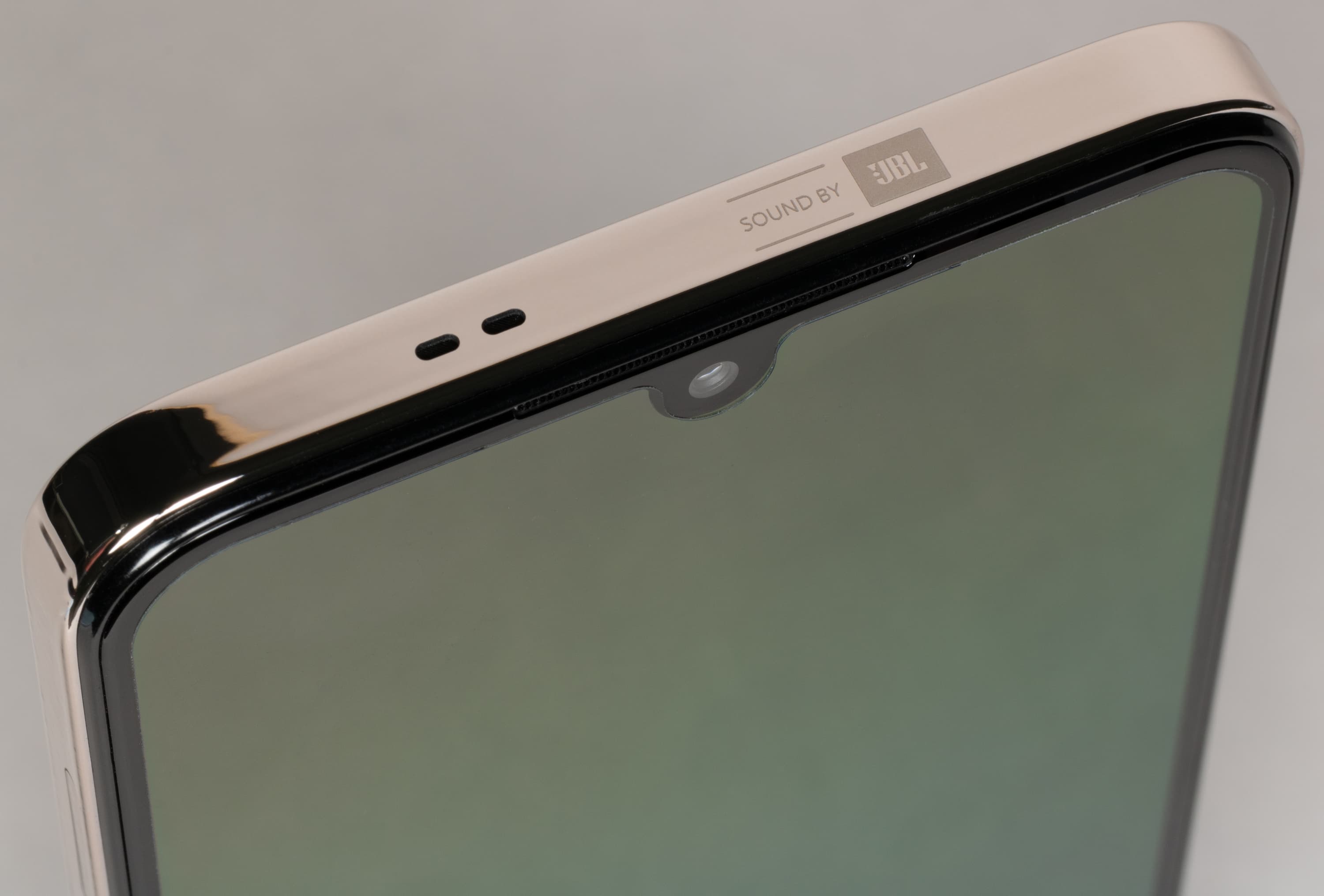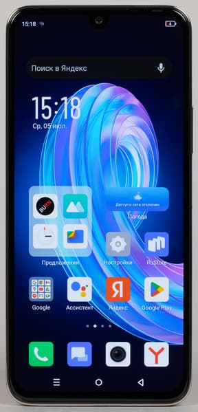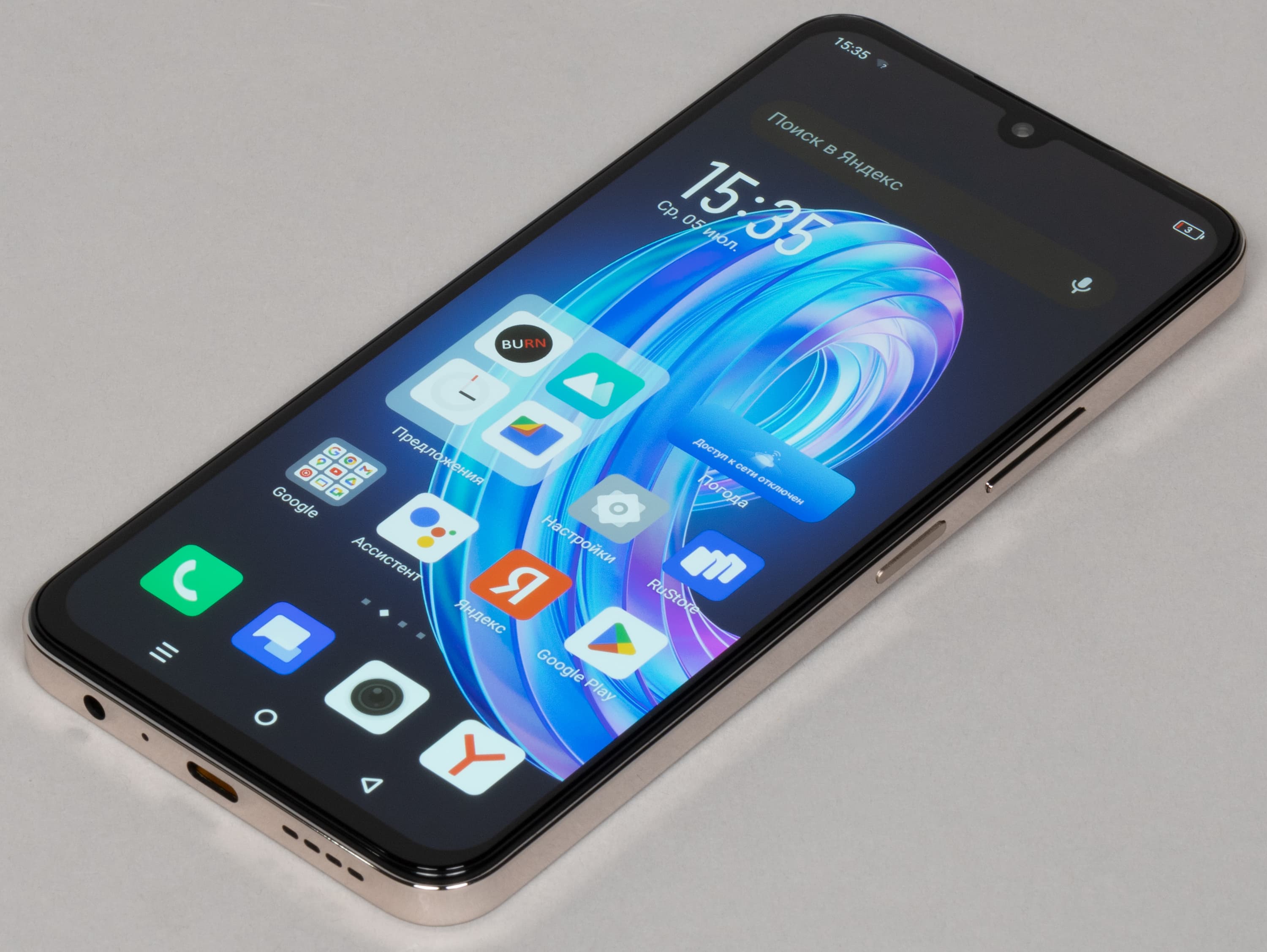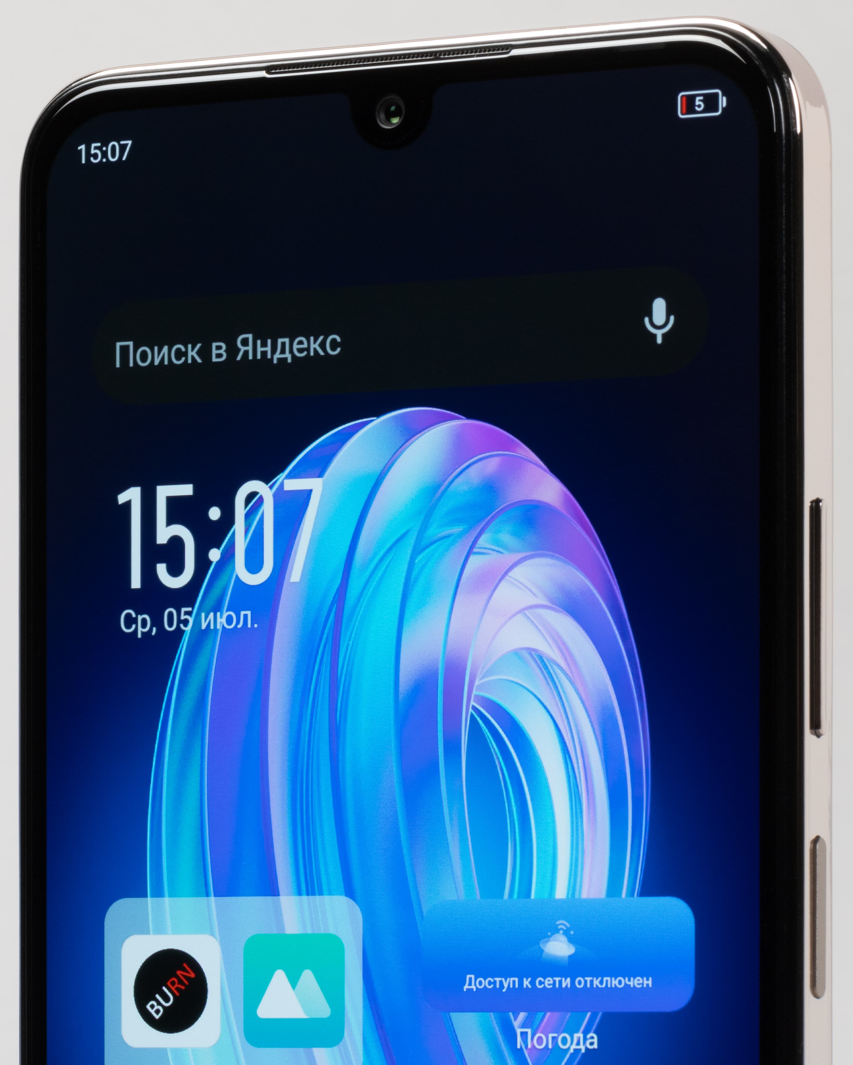 Фронтальная камера установлена здесь не за круглым вырезом в матрице экрана, а в каплевидном вырезе экрана, как и подобает самому бюджетному варианту.