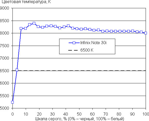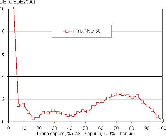 Баланс оттенков на шкале серого компромиссный, так как цветовая температура заметно выше стандартных 6500 К, но отклонение от спектра абсолютно черного тела (ΔE) меньше 3 единиц, что для потребительского устройства считается великолепным показателем. При этом цветовая температура и ΔE мало изменяются от оттенка к оттенку — это положительно сказывается на визуальной оценке цветового баланса. (Самые темные области шкалы серого можно не учитывать, так как там баланс цветов не имеет большого значения, да и погрешность измерений цветовых характеристик на низкой яркости большая.)