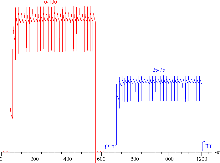 Переключение состояния элементов матрицы выполняется практически мгновенно, но на фронте включения и реже выключения может присутствовать ступенька шириной примерно 17 мс (что соответствует частоте обновления экрана примерно в 60 Гц). Например, так выглядит зависимость яркости от времени при переходе от черного к белому и между оттенками серого 25% и 75% по численному значению: